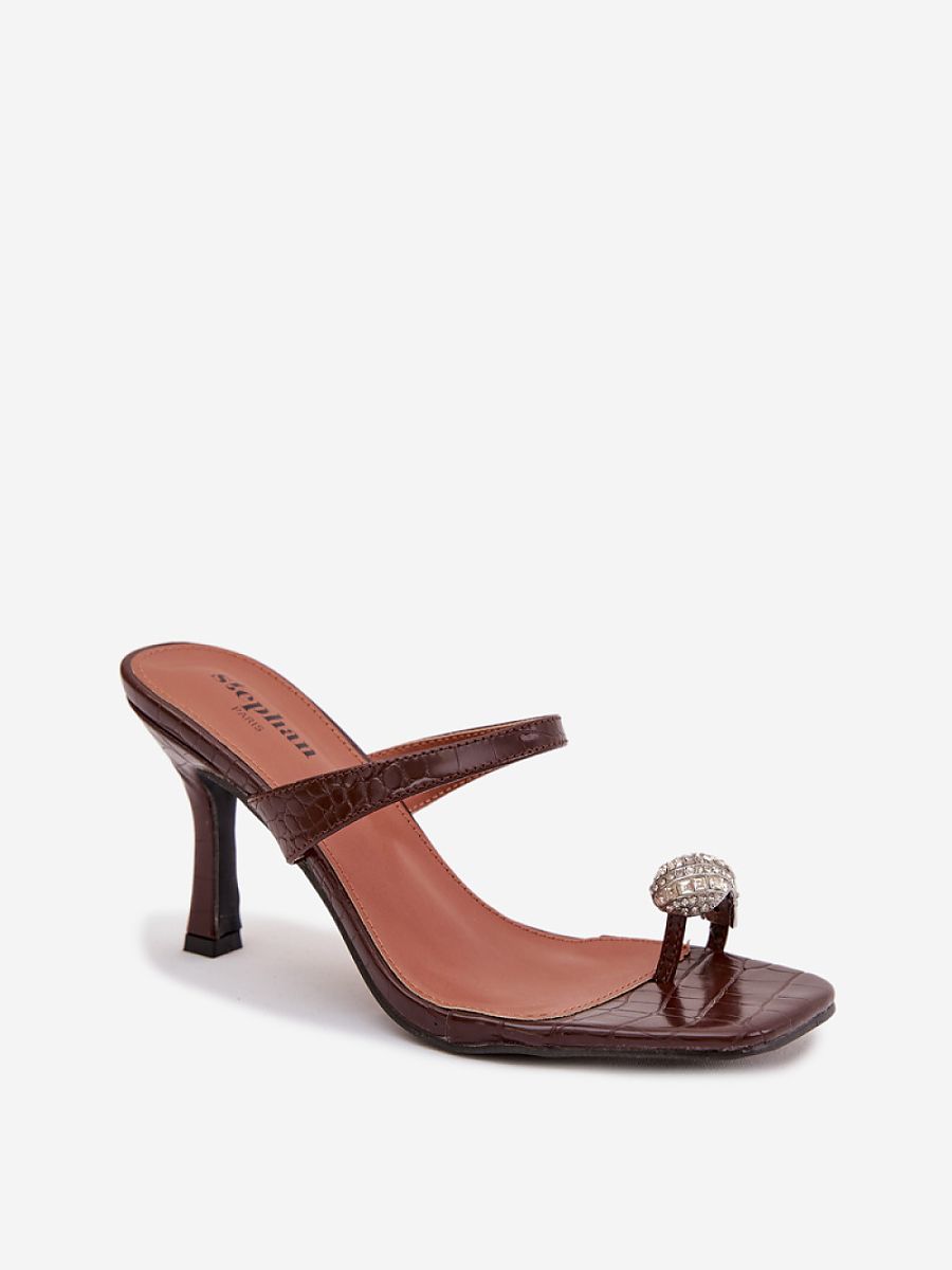 Elegant women’s flip-flops made of eco leather are a unique proposition for women who appreciate style and a feminine look. The slim stiletto heel beautifully accentuates the silhouette, adding lightness and elegance. The strap on the instep provides stability, and the decorative, jewelry detail on the toe catches the eye and gives the whole a luxurious character. This model will work perfectly for evening outings, receptions, and special occasions.