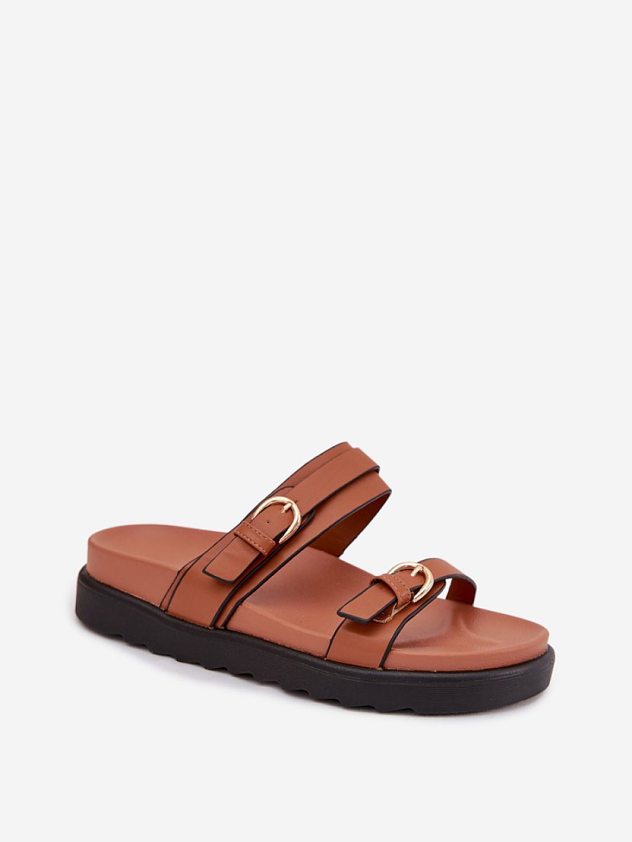 Women’s sandals made of eco leather are a fashionable proposal for warmer days. The model set on a platform ensures walking comfort and slightly elevates the silhouette. The characteristic element is the straps decorated with gold buckles, which emphasize the stylish look of the footwear and attract attention. These practical sandals are perfect for everyday and summer stylizations.