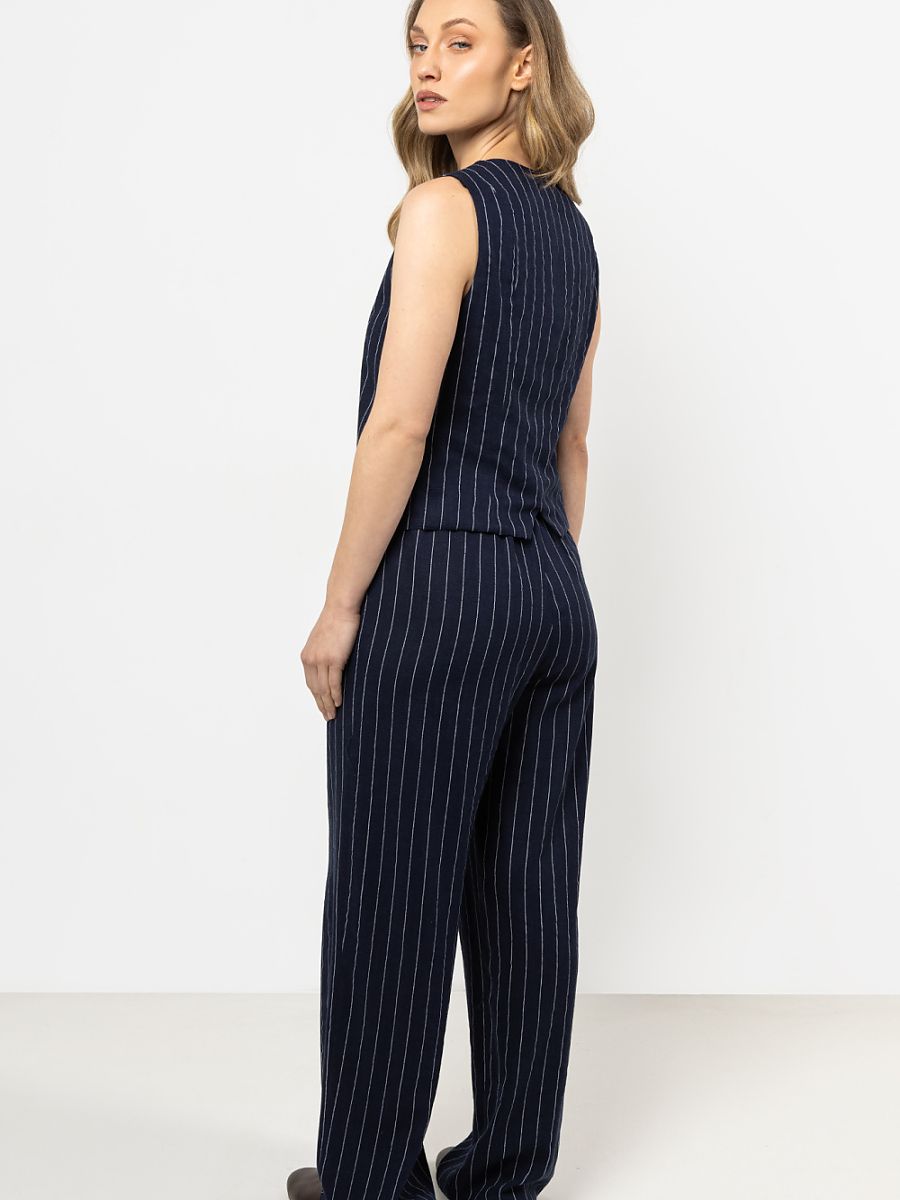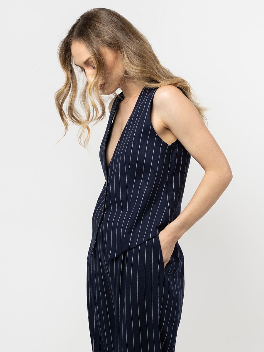 Linen vest in delicate stripes This vest is the perfect combination of style and comfort. Made from breathable linen, it ensures comfort on warm days. The short, simple cut and V-neck subtly highlight the silhouette, while the cotton lining increases wearing comfort. It is perfect for both casual and elegant outfits. Linen pants, both wide and cigarette-style, pair well with the vest. Combine the pants with the linen vest to create a stylish suit.