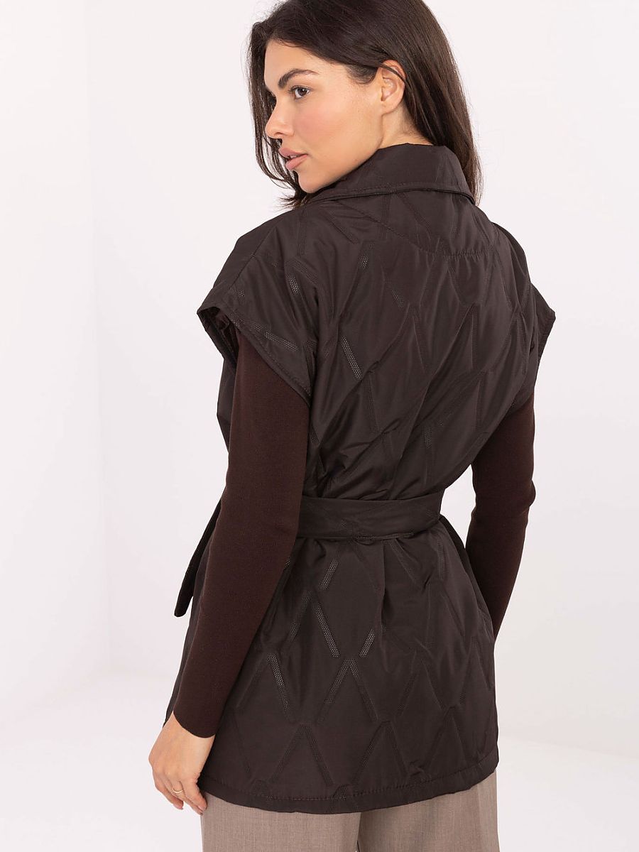 Elegant women’s quilted vest of standard length, buttoned and equipped with classic lapels. Made of polyester, with synthetic filling, it is light and comfortable to wear, while also practical in transitional periods ideal for autumn, winter, and spring. The model stands out with charming quilting and a varied texture of the material, giving it a unique character. There is a tie belt at the waist, which beautifully emphasizes the silhouette. Inserted pockets add functionality, and a brooch on the lapel is an elegant, subtle accent. It is an ideal proposition for everyday wear and work, combining comfort, feminine elegance, and timeless style, creating a universal wardrobe element.