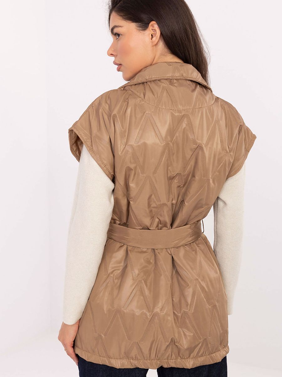 Elegant women’s quilted vest of standard length, fastened with a button and equipped with classic lapels. Made of polyester, with synthetic filling, it is lightweight and comfortable to wear, while also practical in transitional periods, ideal for autumn, winter, and spring. The model stands out with charming quilting and a varied texture of the material, giving it a unique character. There is a tie belt at the waist, which beautifully emphasizes the silhouette. Inserted pockets add functionality, and the brooch on the lapel is an elegant, subtle accent. It is an ideal proposal for everyday wear and work, combining comfort, feminine elegance, and timeless style, creating a universal wardrobe element.