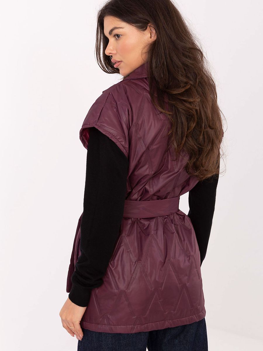 Elegant women’s quilted vest of standard length, fastened with a button and equipped with classic lapels. Made of polyester, with synthetic filling, it is light and comfortable to wear, and at the same time practical in transitional periods, ideal for autumn, winter and spring. The model stands out with charming quilting and a varied texture of the material, giving it a unique character. There is a tie belt at the waist that beautifully accentuates the silhouette. Slip pockets add functionality, and a brooch on the lapel is an elegant, subtle accent. It is an ideal proposition for everyday wear and work, combining comfort, feminine elegance, and timeless style, creating a versatile wardrobe piece.