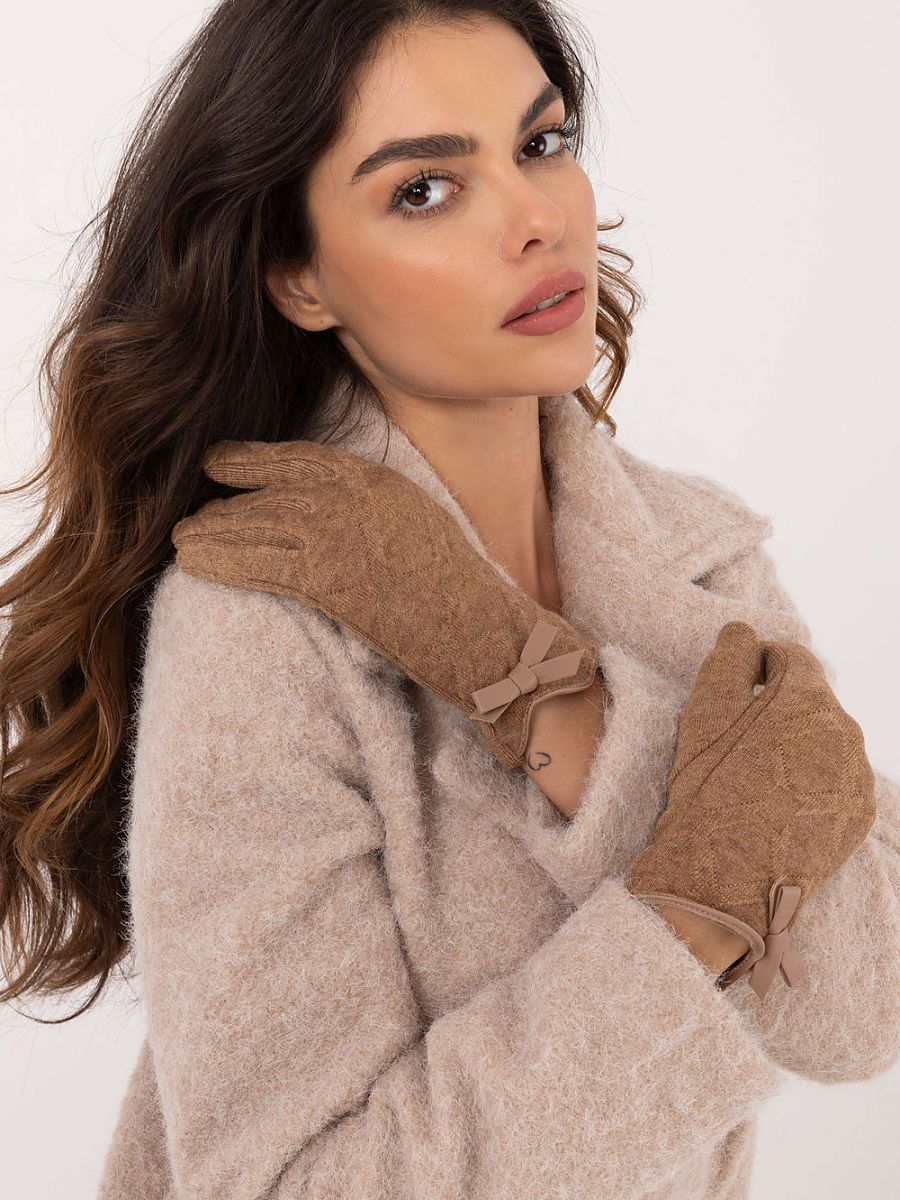 Elegant women’s gloves made of insulated material in an interesting pattern. At the wrists decorative bows. Index finger with an embroidered flower, allowing to operate the phone, without having to take off the gloves.