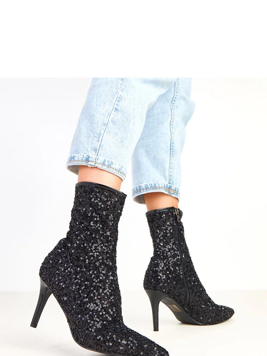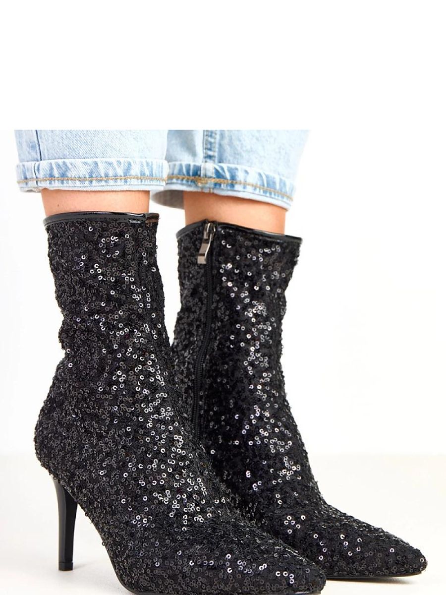 Dazzling ankle boots for women made of elegant fabric and covered with sequin finish all over the surface, which beautifully reflects light and attracts attention. Slim pointed toe and 8.5-centimeter stiletto heel add exceptional lightness and elegance. The model with a shaft height of 18 cm effectively emphasizes the ankle, and the practical zipper closure makes it easy to put on. The interior is finished with soft fabric, which ensures wearing comfort despite the elegant character of the footwear. These are shoes designed for special occasions, perfect for evening outfits, cocktail dresses, or stylizations that emphasize shine and glamour.