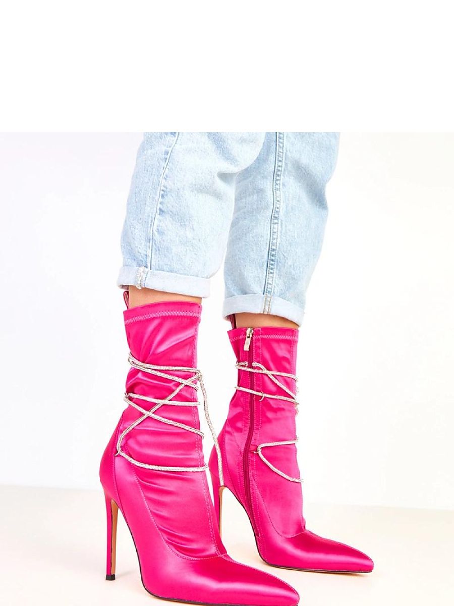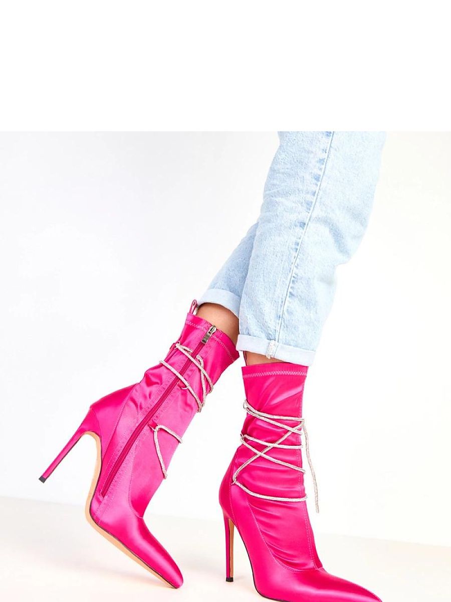 Unique women’s ankle boots made of elegant satin, which attract attention with decorative laces adorned with zircons. The slim pointed toe and slim 12-centimeter heel give the whole a sensual and luxurious character. The model has a 21-centimeter shaft that beautifully emphasizes the leg line, and the practical zipper closure ensures ease of putting on. The interior is finished with a soft fabric, without additional insulation, making it an ideal choice for the spring-summer season or elegant occasions. These impressive and shiny ankle boots will perfectly complement evening stylizations, adding class and dazzling character to them.