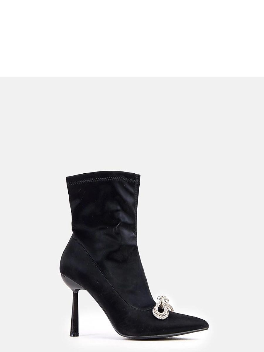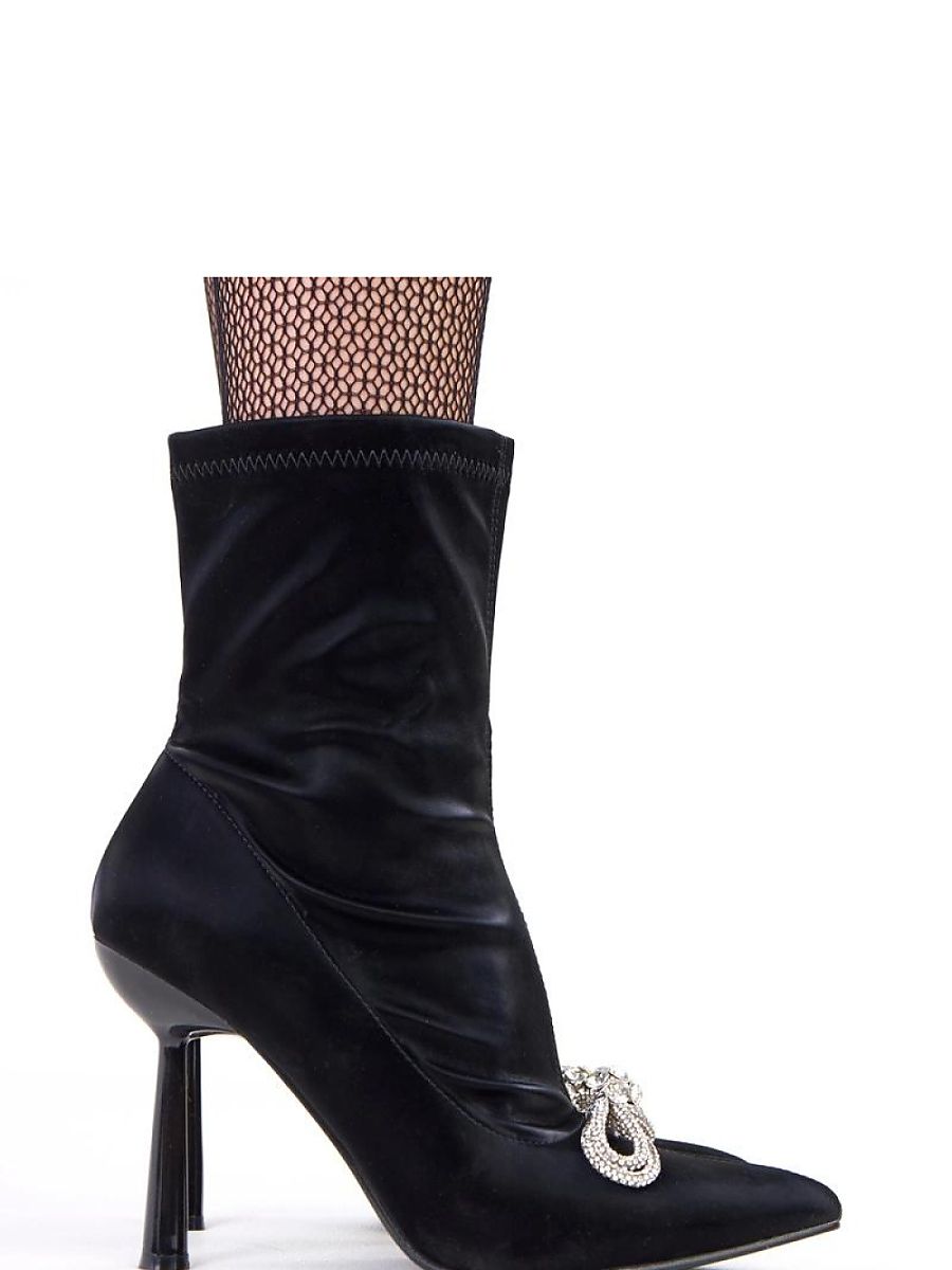 Satin ankle boots with a decorative bow made of zirconia are a proposal for women who like to stand out with elegance and a unique style. Made of delicate fabric with a subtle shine, they look extremely chic, and the decorative bow studded with zirconia adds a luxurious character to them. The slim, pointed toe and the 16 cm high shaft beautifully emphasize the line of the foot and leg. The stable 10.5 cm high heel optically slims the silhouette and adds feminine charm. The eco-leather insole ensures comfort, and the practical zipper closure makes it easy to put on. The ankle model is the perfect choice for special occasions when elegance and a striking detail matter.