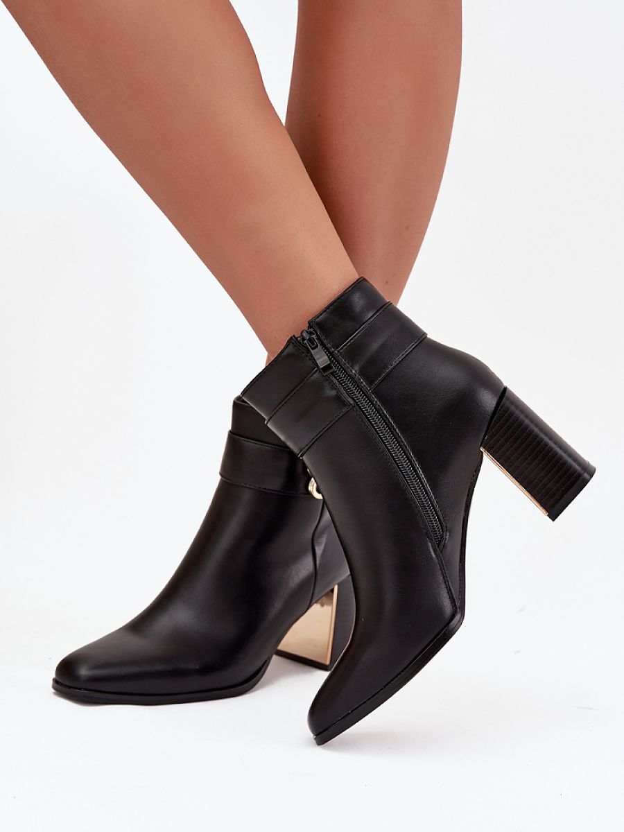 Women’s ankle boots made of eco leather. The model is set on a stable column-shaped heel, decorated with a golden, mirrored element that gives the whole a unique character. The shoes are fastened with a zipper, which ensures easy putting on and perfect fit. The top of the upper is adorned with a strap with a decorative detail, providing a subtle, stylish accent. These are universal ankle boots that will work great in both elegant and everyday stylizations.