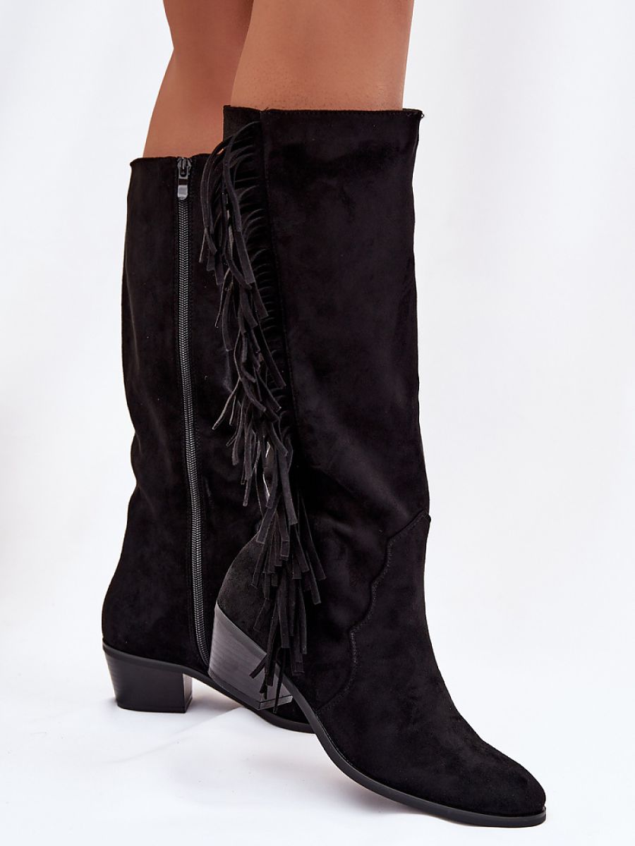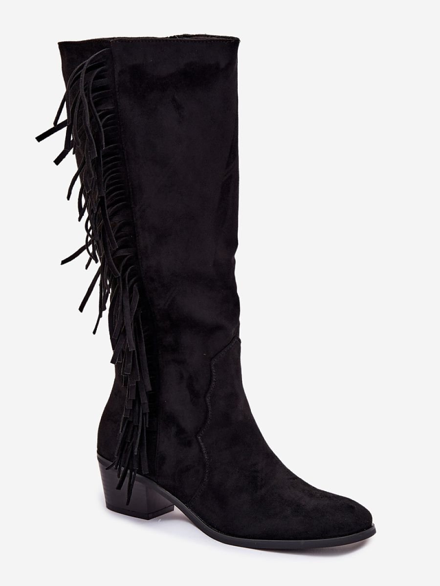 Women’s boots made of eco-suede are a stylish proposition for cooler days. The model, set on a low, beveled heel, ensures comfort and stability, while almond toes add elegance to them. The interior lined with shoe fleece guarantees warmth and comfort while wearing. The shaft is decorated with fashionable fringes, which give the whole a characteristic, feminine accent. Perfect for autumn-winter stylizations.