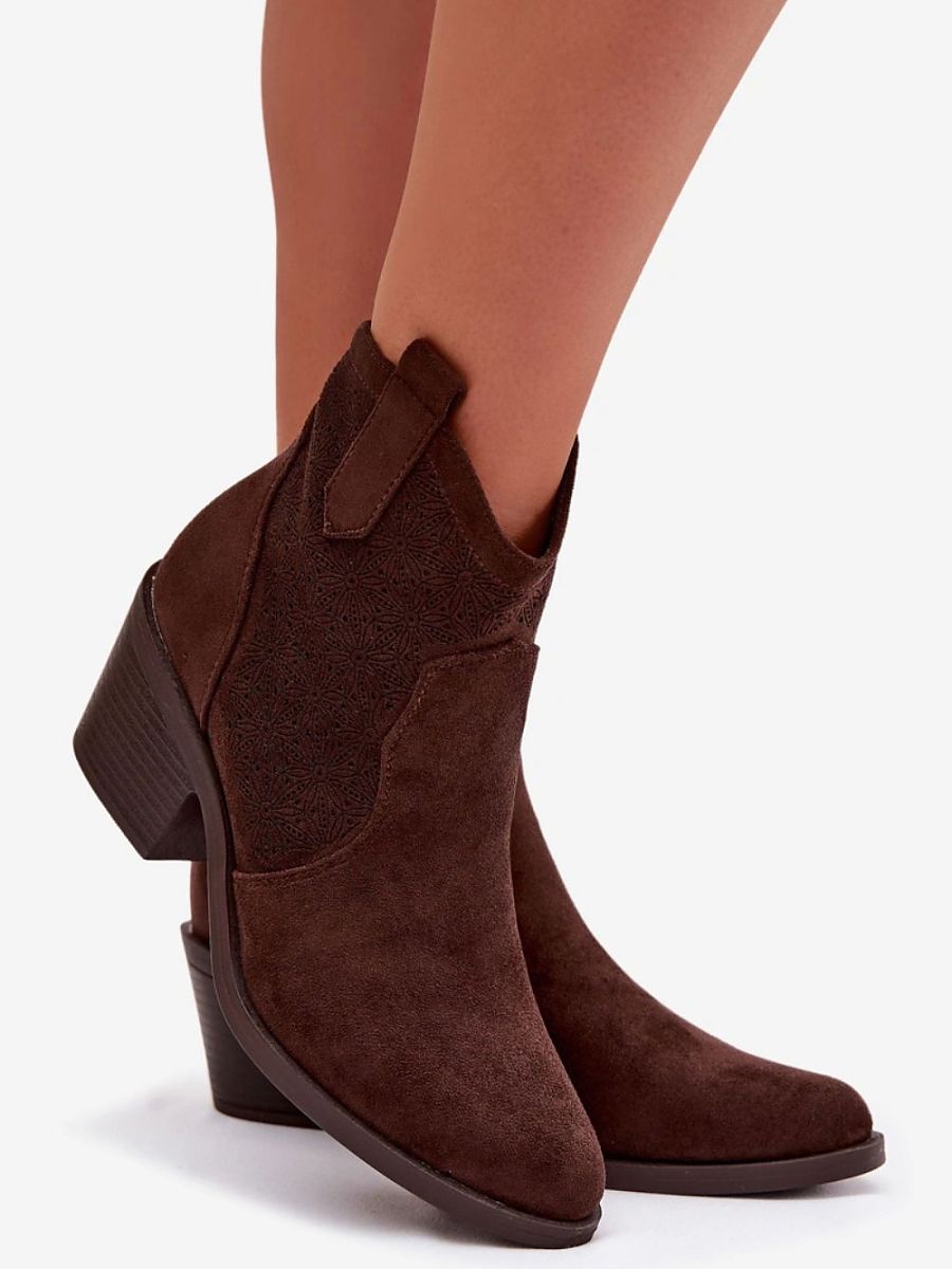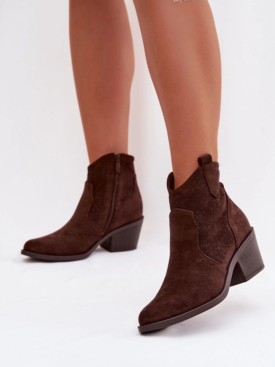 Women’s cowboy-style ankle boots from the S.Barski brand are a fashionable proposal that will perfectly emphasize the character of spring stylizations. Made of eco-suede. The characteristic element of this model is the openwork pattern on the upper, which gives them lightness and originality. The boots are set on a stable, beveled heel, which provides comfort while walking, and at the same time adds a stylish finish inspired by the western atmosphere. Almond toes visually slim the foot and emphasize the feminine character of the shoes. This is a model that will work perfectly in both everyday, casual outfits and more expressive stylizations with a boho touch.