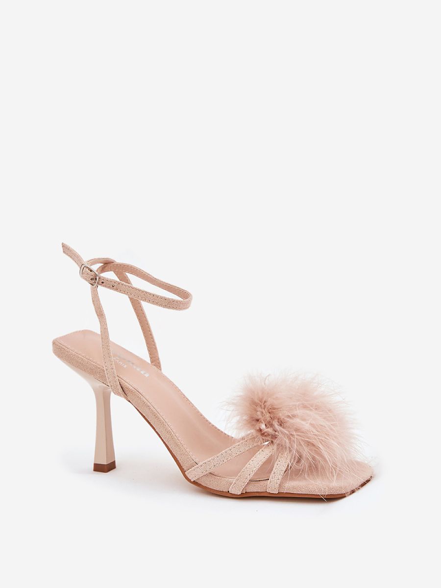 Elegant women’s sandals made of eco-suede, perfect for special occasions. Set on a stylish stiletto heel, they stand out with a subtle feather decoration at the front, giving them lightness and a refined character. The adjustable strap with a buckle allows for a perfect fit to the foot. This unique choice will perfectly complement evening and cocktail outfits, attracting attention with its unique appearance.