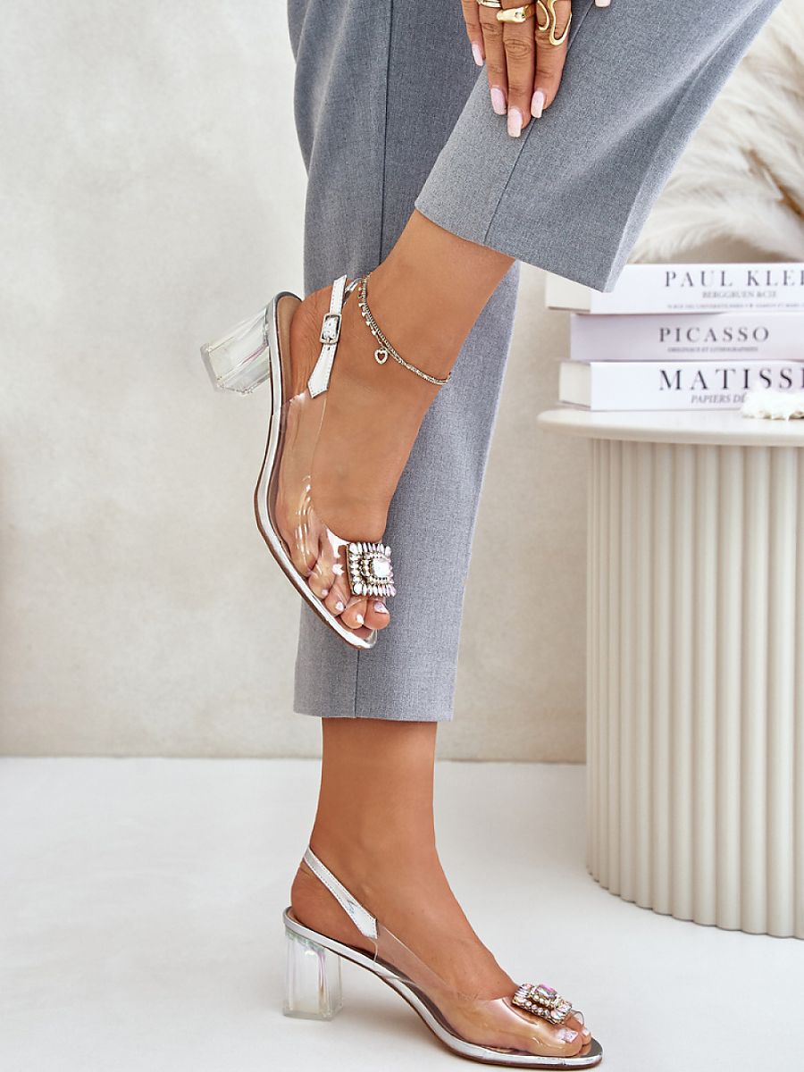 Women’s sandals with a transparent upper. Set on a column-shaped heel. At the front, there is a brooch that adds elegance. The soft insole is made of natural leather. Perfect for various occasions.