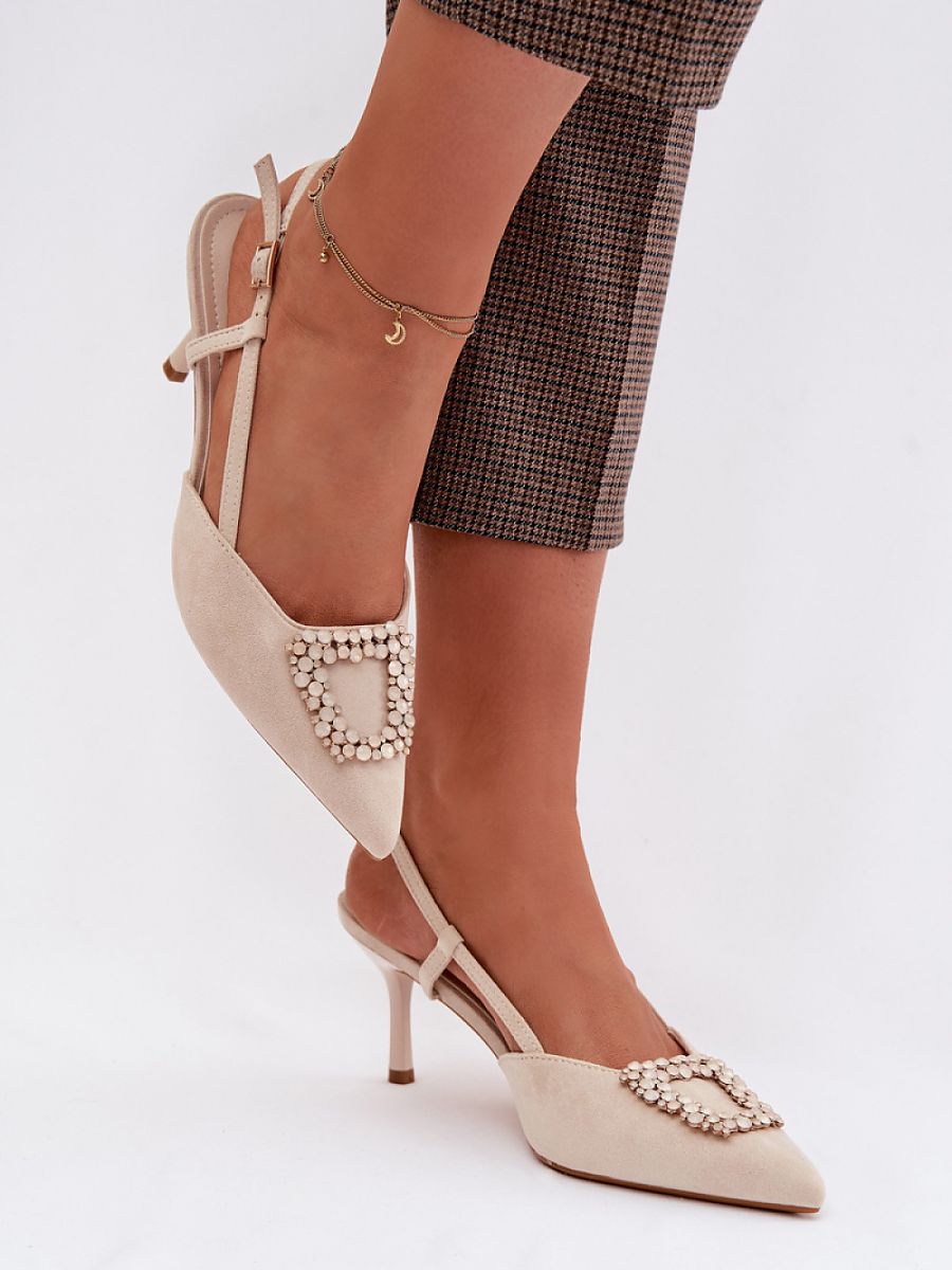 Elegant women’s sandals made of eco suede are a stylish proposition for special occasions. The slender stiletto heel and pointed toes beautifully slim the silhouette and give the whole a feminine character. The decorative detail at the front attracts the eye and emphasizes the elegant look of the model. The adjustable strap fastened with a buckle allows for the perfect fit of the sandals to the foot, ensuring comfort when worn. These sandals will be perfect for parties, ceremonies, and evening outings.