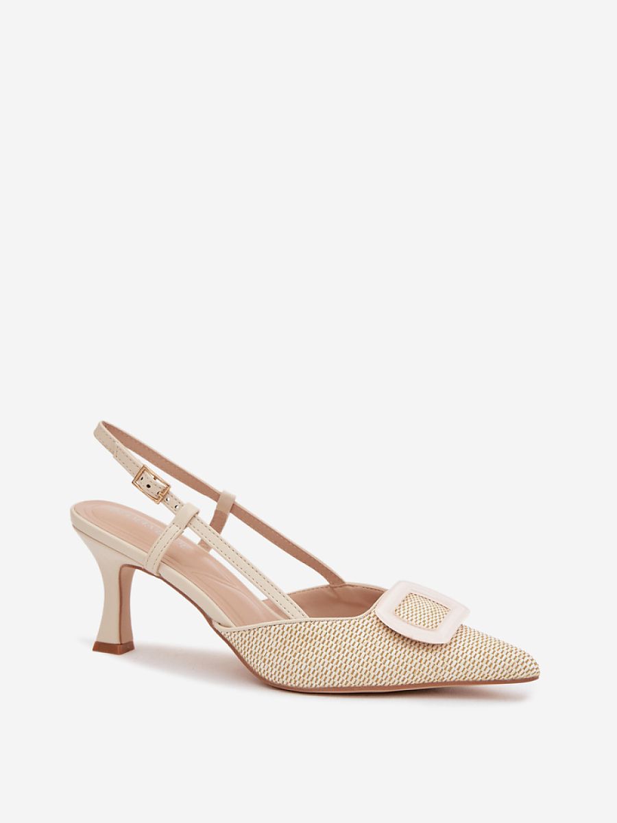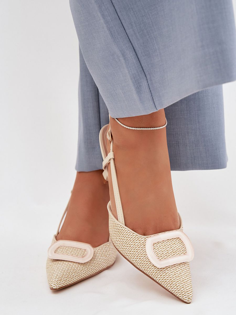 Women’s sandals made of a combination of eco leather and synthetic material are a stylish proposition for feminine styling. Pointed toes emphasize the slim line of the foot and give the model an elegant character. The shoes are set on a slim heel, which subtly elongates the silhouette and adds lightness to the steps. A buckle closure with an adjustable strap allows for a perfect fit to the foot, ensuring comfort and stability. An ornamental element placed at the front attracts attention and is a spectacular detail, making the sandals perfect for elegant outings and special occasions.