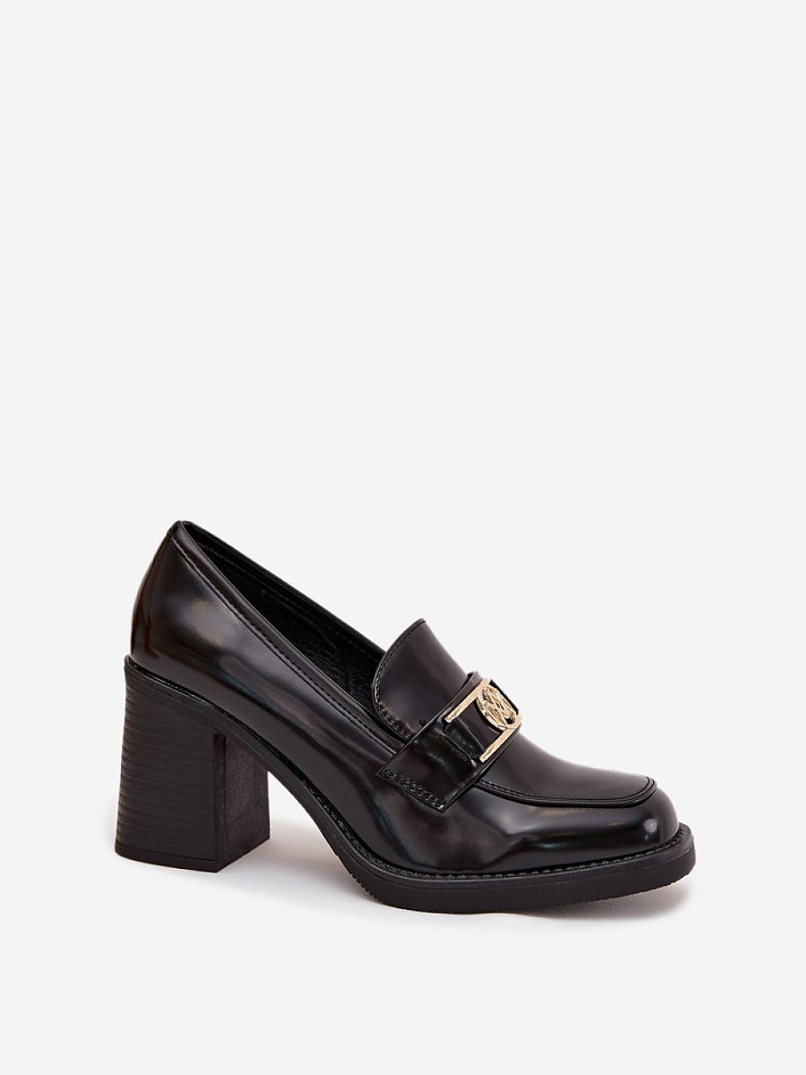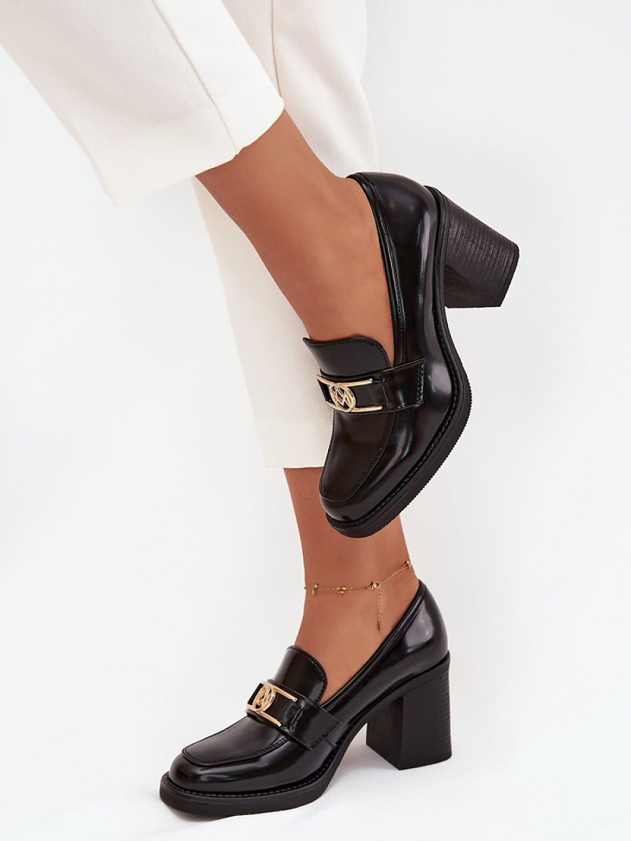 Women’s shoes made of eco leather are an elegant and versatile proposal for many occasions. Set on a stable column heel, they provide comfort and subtly slim the silhouette. The attention is drawn to the gold detail placed on the strap at the front, which adds an elegant character to the whole. These are shoes that will work great in both everyday and formal stylizations.