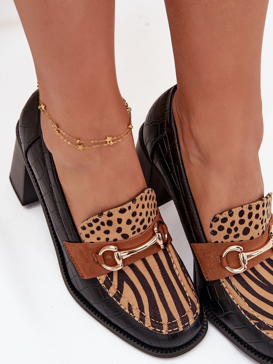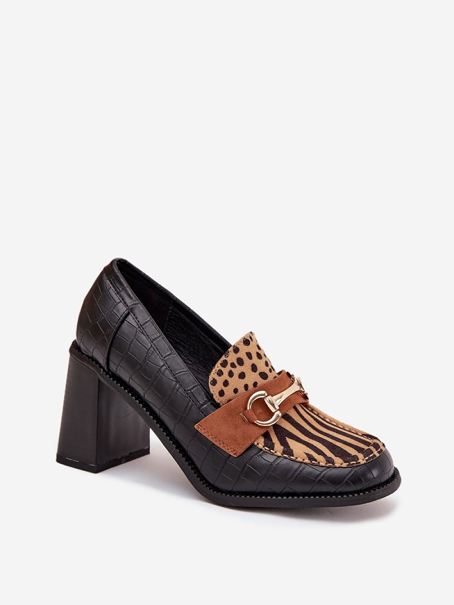 Women’s shoes made of elegant eco leather are a stylish proposal for many occasions. Set on a stable column heel guarantee comfort of wearing and at the same time add lightness to the silhouette. Classic, rounded toes make the shoes look subtly and femininely, and decorative embossing gives them a unique character. The charm of the whole is added by the gold detail, which is an elegant accent and emphasizes the modern style of the footwear. This model will work great both in everyday outfits and in more formal stylizations, combining comfort with timeless elegance.