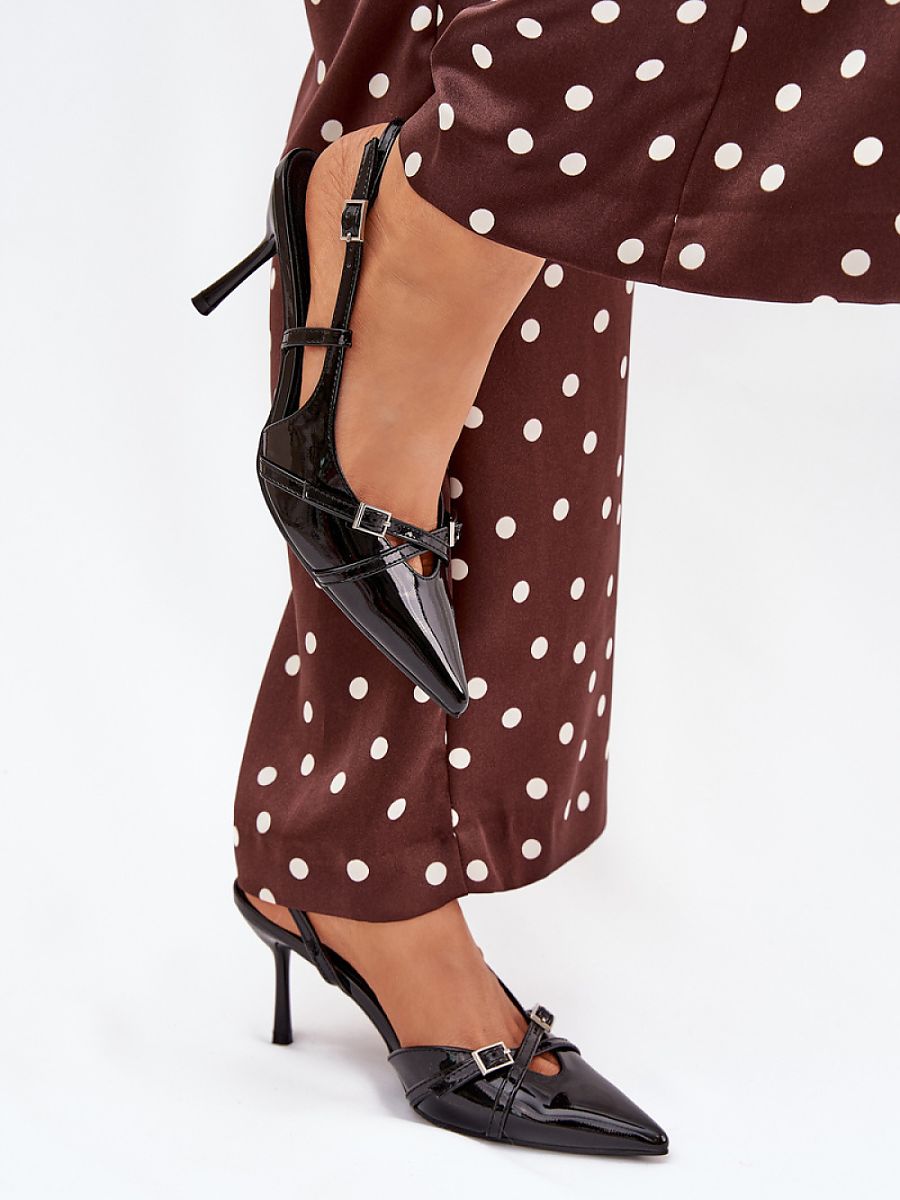 Women’s pumps with open heel, set on a stiletto, are a perfect proposal for special occasions. In the front, there are two interlacing straps decorated with small buckles, which add a subtle charm to them. Pointed toes elongate the legs, giving the silhouette slimness and elegance. Perfect for evening outings, weddings, or other celebrations.