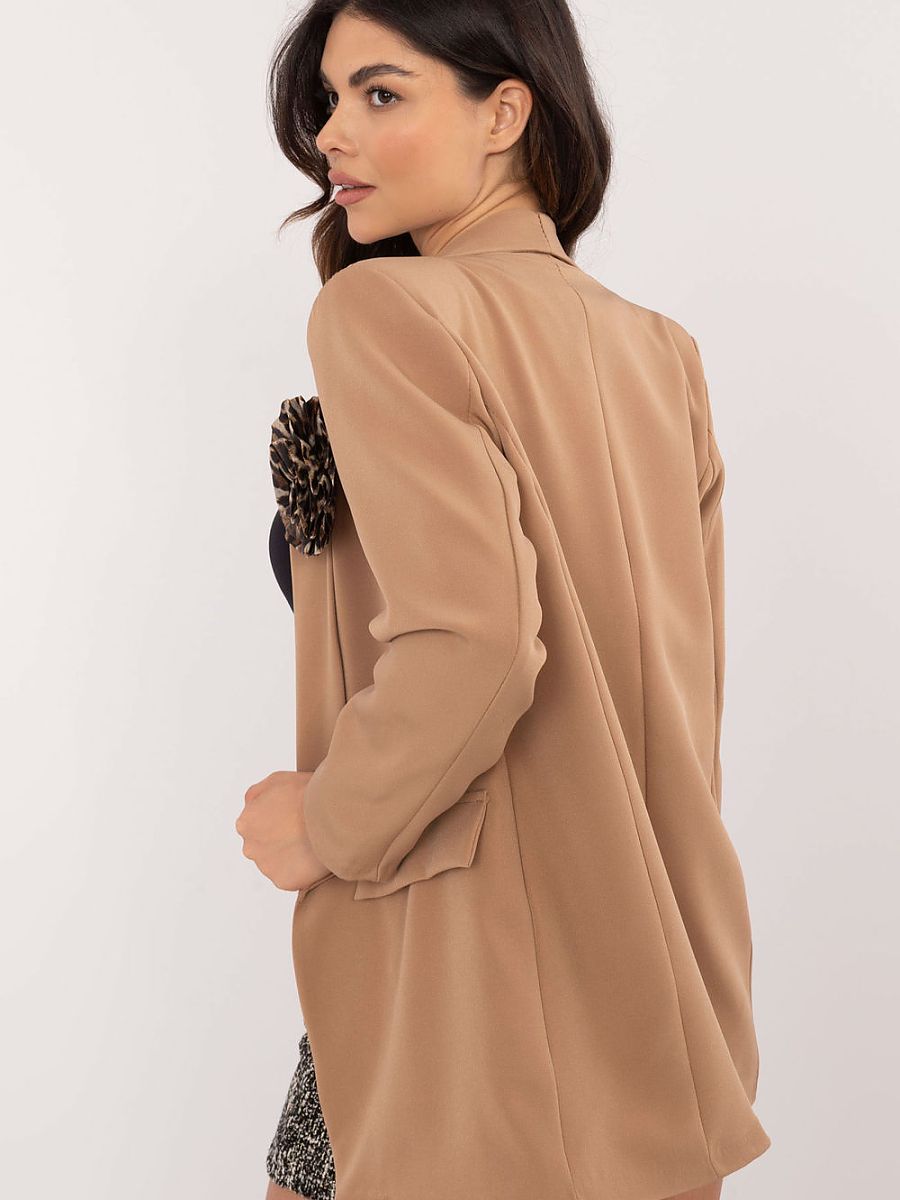Elegant jacket in a classic cut with shoulder pads, ideal for work or formal meetings. Made of smooth material, it presents a standard length that subtly emphasizes the silhouette. On the front it is decorated with a striking fabric flower in a leopard pattern, which gives the whole an original character. The jacket does not have a clasp, which gives it a casual, but still sophisticated look. The interior is finished with a lining in a fashionable leopard pattern, which adds a unique touch. This is an excellent choice for women who appreciate style, elegance and a touch of bold details.