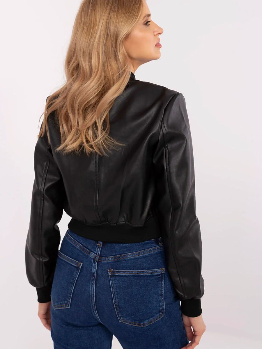 Women’s bomber jacket made of eco leather is a stylish and functional choice for the transitional season. Made of a combination of polyurethane, polyester, viscose, and cotton, it provides comfort and a fashionable look. Its classic, smooth design and casual style make it perfect for everyday outfits. The short cut accentuates the silhouette, and the long sleeve provides comfort on cooler days. The jacket is fastened with snaps, giving it a modern character. Additional pockets with flaps on the front emphasize the sporty style and increase practicality. The model is equipped with lining, making it ideal for transitional seasons.