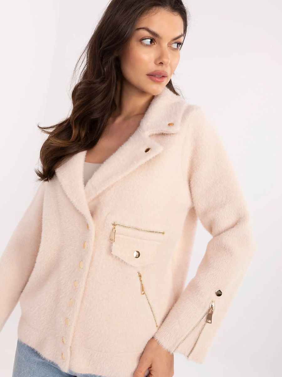 Elegant and comfortable women’s jacket perfect for cooler days. Its casual character makes it perfect for everyday wear, combining style with functionality. The jacket is made of a high-quality blend of materials such as wool, polyester, viscose, and angora, ensuring durability and comfort. Standard length, ideal for daily styling. Jacket fastened with snaps, pockets with zippers. Sleeves decorated with zippers, giving the jacket a modern character. This jacket is a perfect choice for women who value style and comfort, looking for a versatile wardrobe piece for the autumn-winter season.