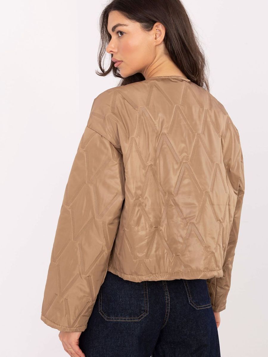 Women’s quilted jacket with an elegant character, perfect as a transitional outerwear for the autumn/winter/spring season. Made of polyester, it stands out with a varied texture of the material and subtle quilting, which gives the whole a unique look. The collarless model looks modern and light, making it a great choice for both everyday styling and work. The jacket has no fastening, so it lays freely and comfortably. An additional advantage is a butterfly-shaped brooch, which serves as an elegant decoration and adds a feminine touch. This lightweight, unlined jacket will be a stylish addition to spring and autumn outfits, combining comfort with timeless elegance.