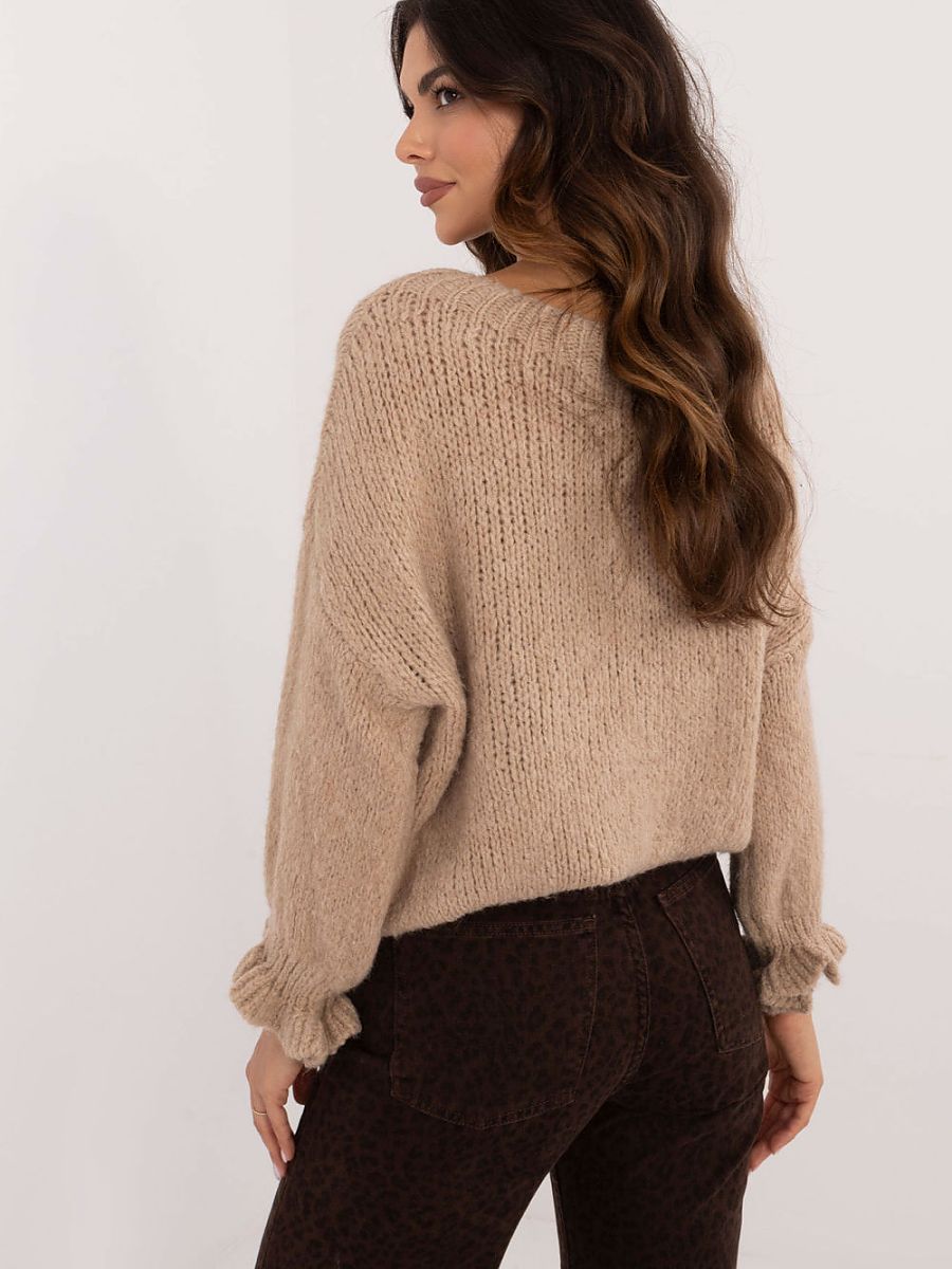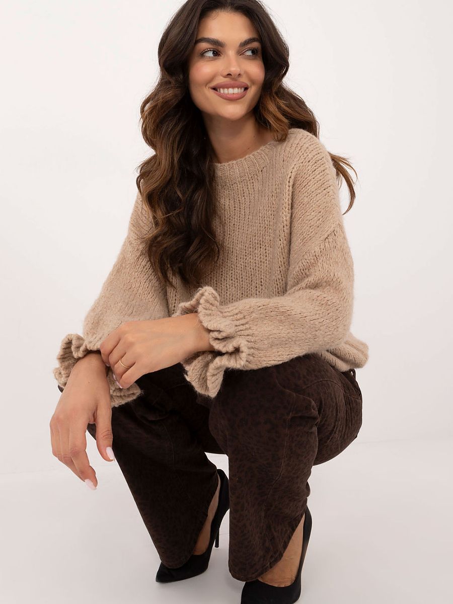 Casual sweater of standard length, perfect for everyday wear and work, made of a blend of acrylic, wool (lana), viscose, and polyamide. Smooth pattern and classic round neckline give it a universal character, while ruffles on the sleeves add a feminine, fashionable touch. Long sleeves provide comfort and warmth, making the sweater an ideal choice for colder days. Perfect for both casual and more formal styling.