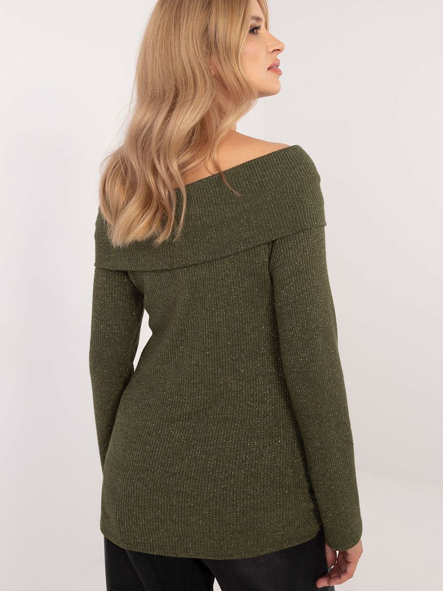 Elegant women’s sweater, perfect for both everyday wear and work. Made of high-quality blend of viscose and elastane, it ensures comfort and perfect fit. The sweater has a ribbed, textured material that adds character and subtle elegance. It features long sleeves and an off-the-shoulder neckline, which stylishly exposes the shoulders, giving the outfit a feminine touch. Additionally, the shiny thread on the material surface adds a delicate, elegant glow to the whole. It is a perfect choice for women who appreciate comfort and style in their everyday outfits.