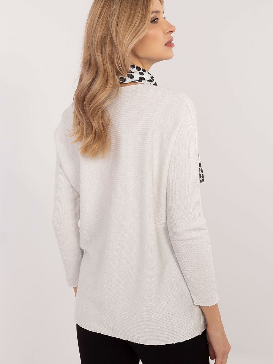An elegant women’s sweater with a subtle, shiny thread, which will work perfectly for everyday wear, to work, and for special occasions. The smooth pattern emphasizes the universal character of the sweater, and the ribbed texture adds a modern style and delicate structure to it. Made of a blend of viscose and elastane, it provides comfort and lightly fits the silhouette. The standard length and V-neck create a classic look, and the lack of fastening gives it a casual elegance. The long sleeves are perfect for cooler days. A scarf is included in the set, which is the perfect complement to the outfit.