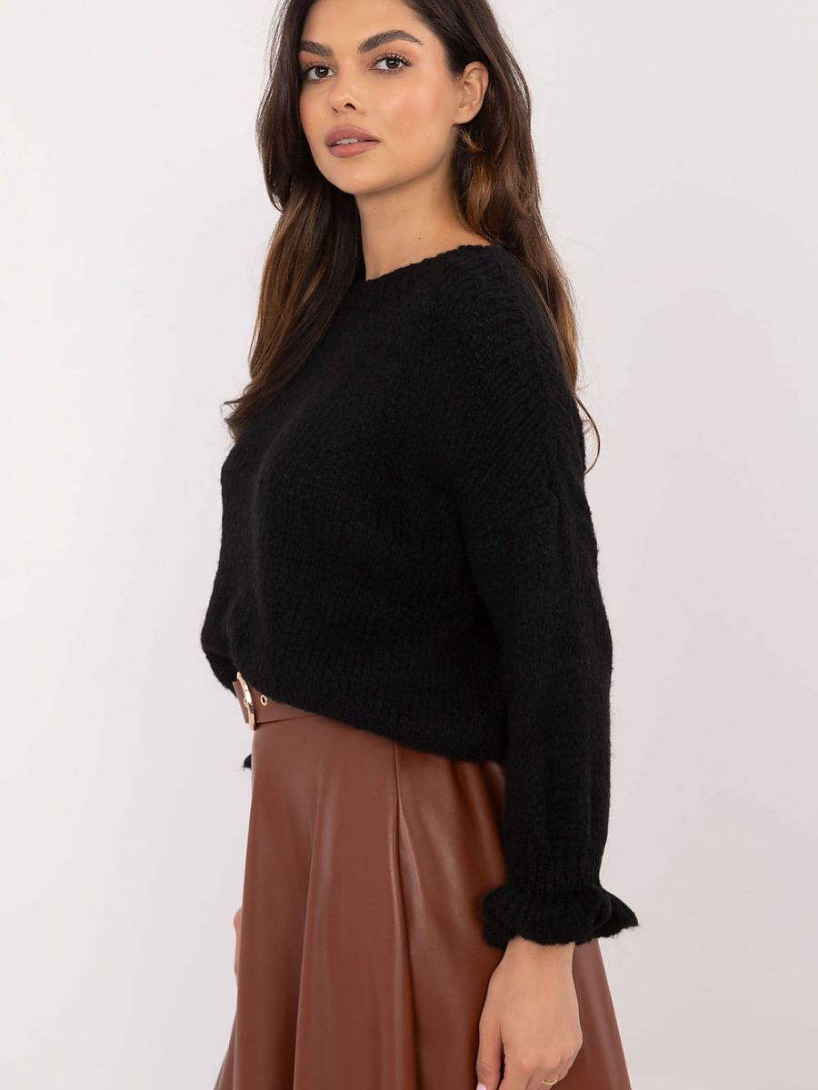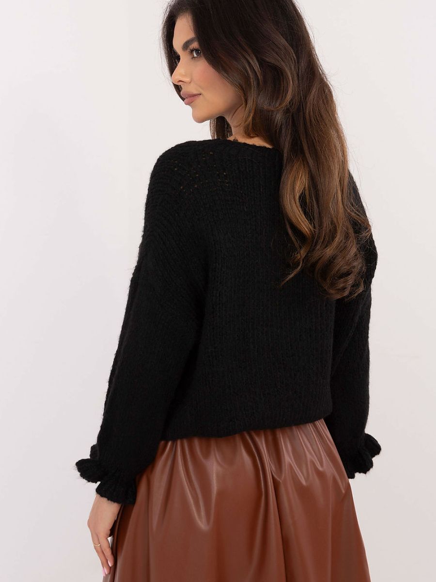 Stylish women’s sweater with a casual character, perfect for everyday wear and for work. Made of high-quality blend of acrylic, wool (lana), viscose, and polyamide, it is soft, pleasant to the touch, and comfortable to wear. The smooth pattern gives it an elegant simplicity, and the 3/4 sleeves decorated with a subtle ruffle add a feminine charm. The standard length makes it perfect to pair with jeans as well as more formal pants or skirts. This is an ideal choice for women who appreciate style, comfort, and timeless elegance.