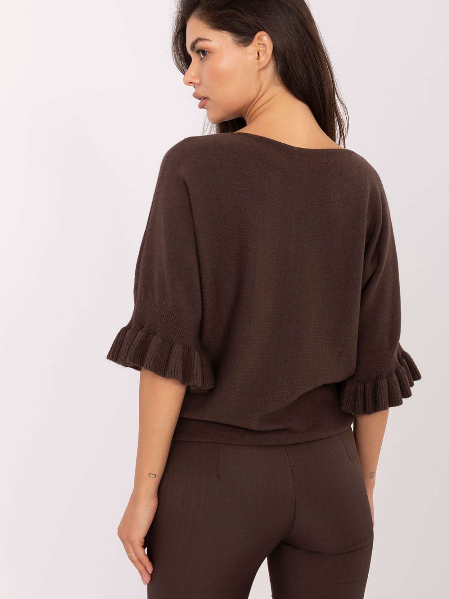 An elegant women’s sweater of a standard length, perfect for both everyday wear and more special occasions. Made of high-quality blend of viscose, polyester, and nylon, it ensures comfort and durability. The smooth pattern gives it a timeless character, while subtle details add a feminine charm. The model features a round neckline and 3/4 sleeves finished with a delicate ruffle, emphasizing the elegance and lightness of the styling. This is an excellent choice for women who appreciate classic style in a modern interpretation.