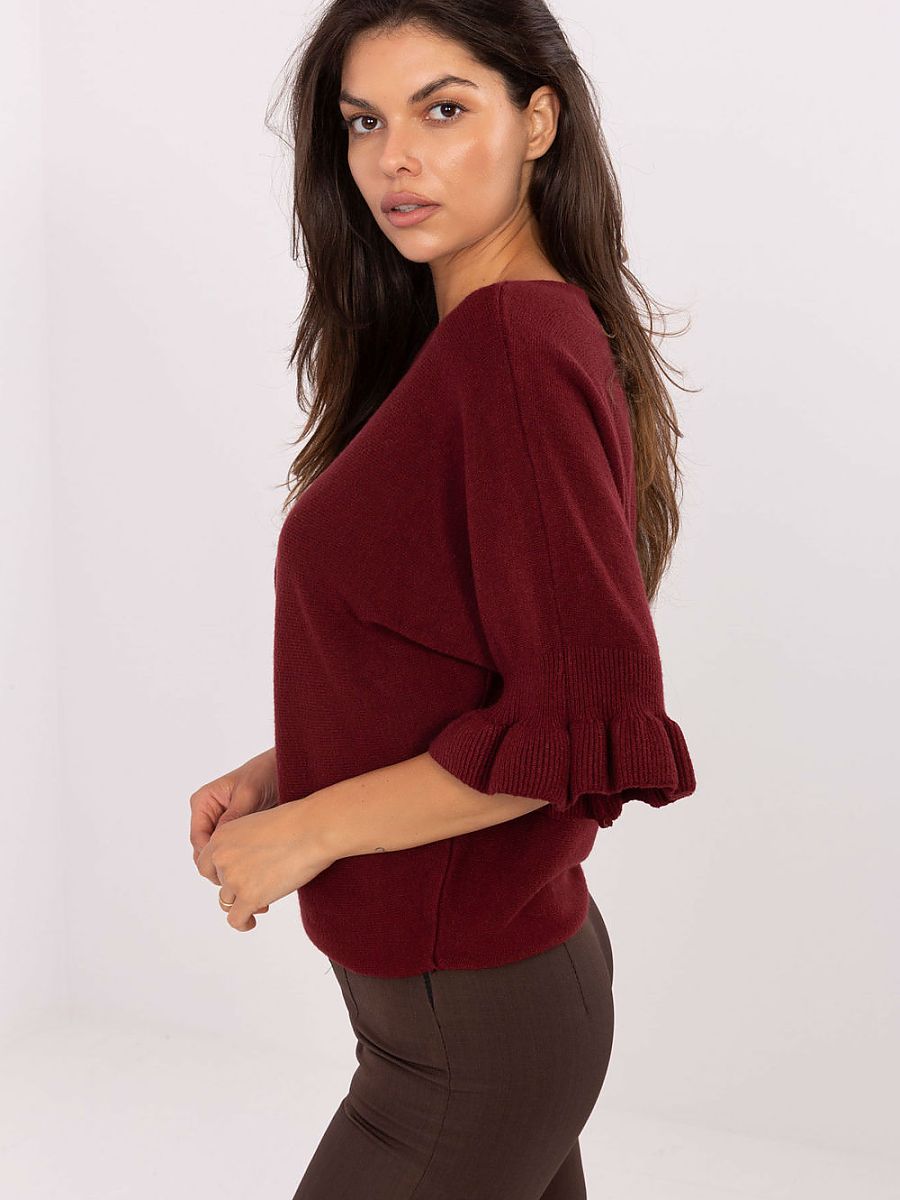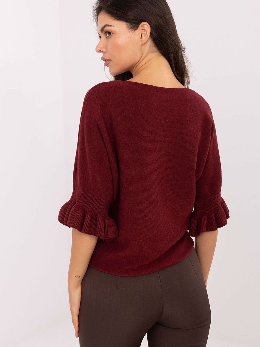 Elegant women’s sweater of standard length, perfect for both everyday wear and more special occasions. Made of high-quality blend of viscose, polyester, and nylon, it ensures comfort and durability. The smooth pattern gives it a timeless character, and subtle details add a feminine charm. The model stands out with a round neckline and 3/4 sleeves finished with a delicate ruffle, which emphasize the elegance and lightness of the styling. This is an excellent choice for women who appreciate classic style in a modern version.