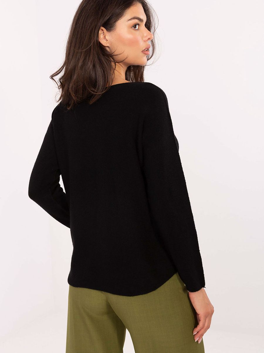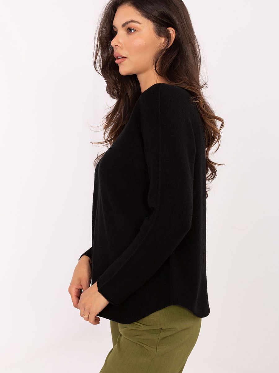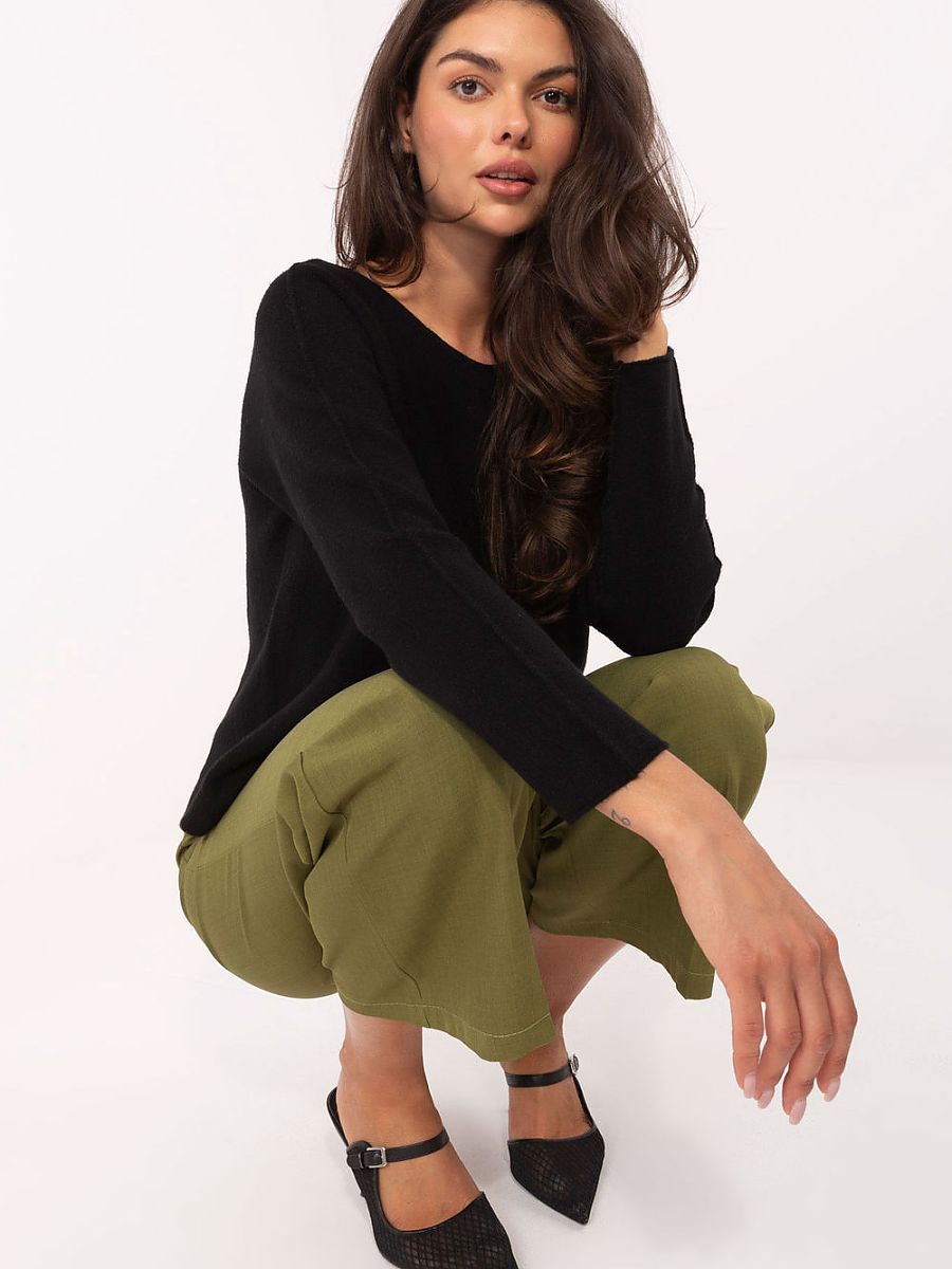 Casual women’s sweater of standard length, perfect for everyday wear and work. Made of high-quality blend of viscose, polyester and nylon, it combines comfort and durability. The smooth pattern makes it versatile and easily matches many styles. The model has a classic round neckline and long sleeves, making it an ideal choice for cooler days. Its unique feature is its reversibility, it can be worn with either the side with visible seam on the outside or the side with hidden seam, providing the freedom to create different looks depending on mood and occasion.