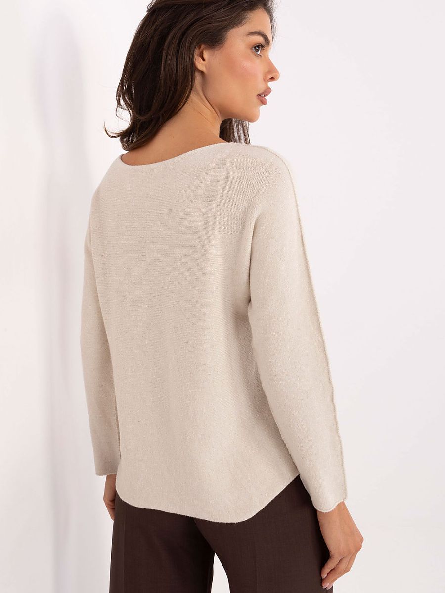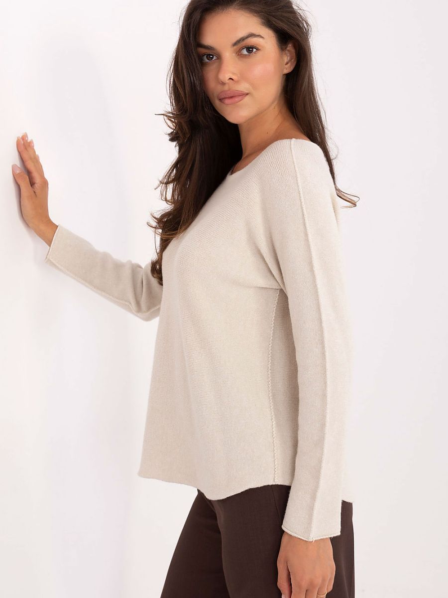 Casual women’s sweater of standard length, perfect for everyday wear and work. Made of high-quality blend of viscose, polyester and nylon, it combines comfort and durability. The smooth pattern makes it versatile and easily matches many styles. The model has a classic round neckline and long sleeves, making it an ideal choice for cooler days. Its unique feature is its reversibility, it can be worn with the visible seam on the outside or with the hidden seam, giving the freedom to create different looks depending on the mood and occasion.