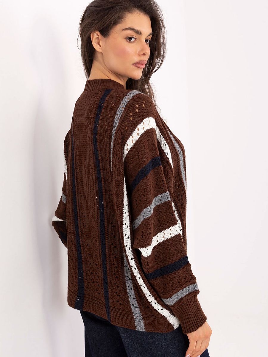 Oversized women’s sweater with a casual character, perfect for everyday occasions. Made of acrylic, it provides warmth and comfort when worn. A model of standard length, with a classic round neckline and long sleeves. The openwork pattern and stripes give it lightness and a unique character, making it perfect to pair with jeans, leggings, or a skirt. This fashionable and comfortable option for cooler days.