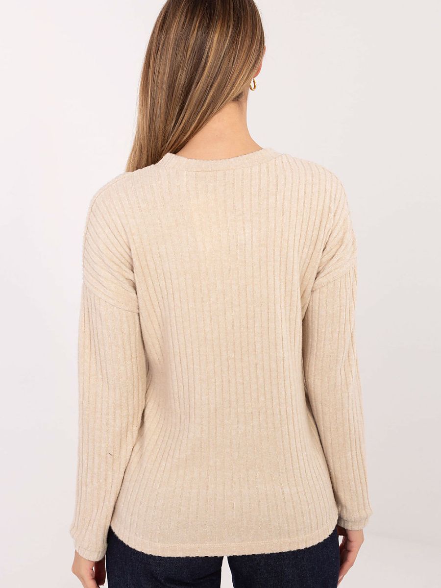 This sweater is a combination of comfort, simplicity, and style, which will work perfectly for everyday wear and casual outfits. Made of high-quality cotton with a hint of elastane, it guarantees wearing comfort, softness, and delicate elasticity, making it perfectly fitting to the silhouette. The standard length and long sleeves make it a versatile wardrobe piece, while the classic round neckline emphasizes its timeless character. The ribbed structure of the material and varied texture give the whole a distinct, fashionable look, remaining subtle and elegant at the same time. The sweater has no fastening, which makes it exceptionally comfortable and easy to style. On the front, there is a small patch adding a delicate, stylish accent. Perfect for daily outings, work, school, or casual meetings, reliable in any situation.