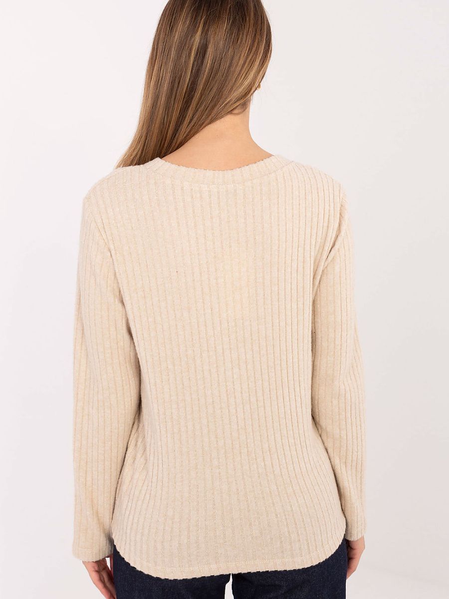 This sweater is a perfect choice for women who appreciate comfort and style in their everyday outfits. Made of high-quality cotton with a touch of elastane, it is soft, pleasant to the touch, and gently elastic, so it fits nicely on the silhouette. The standard length and long sleeves provide comfort for wearing throughout the day, and the V-neck adds a subtle femininity and accentuates the neckline. The varied texture of the material and ribbed structure add character to the sweater, making it interesting yet versatile wardrobe piece. The model has no fastening, making it extremely comfortable and easy to pair with favorite jeans or a skirt. A small patch on the front adds a delicate, stylish accent breaking the minimalism. Perfect for everyday wear to work, school, meetings or quiet days at home. Pleasant, trendy, and timeless.