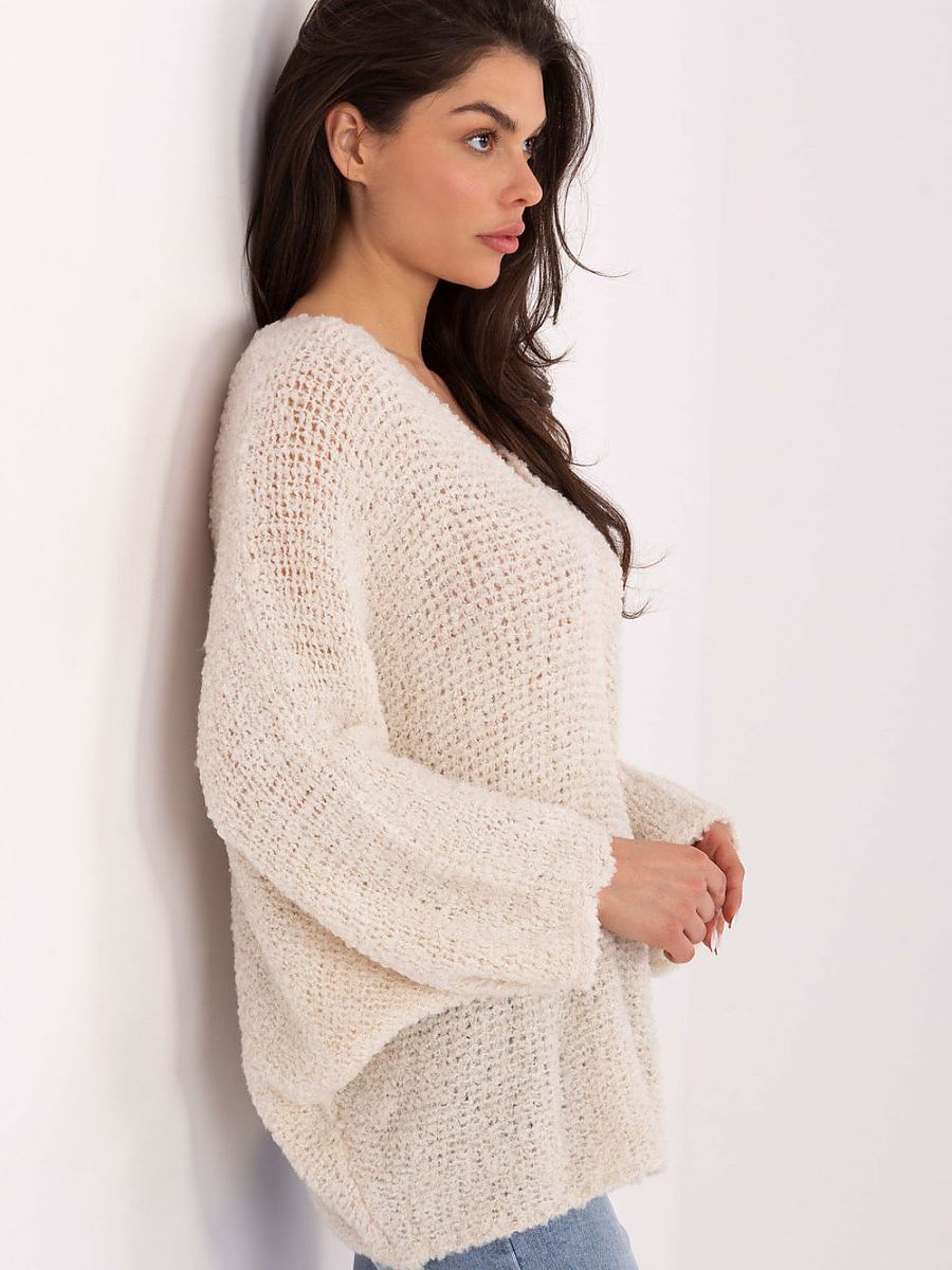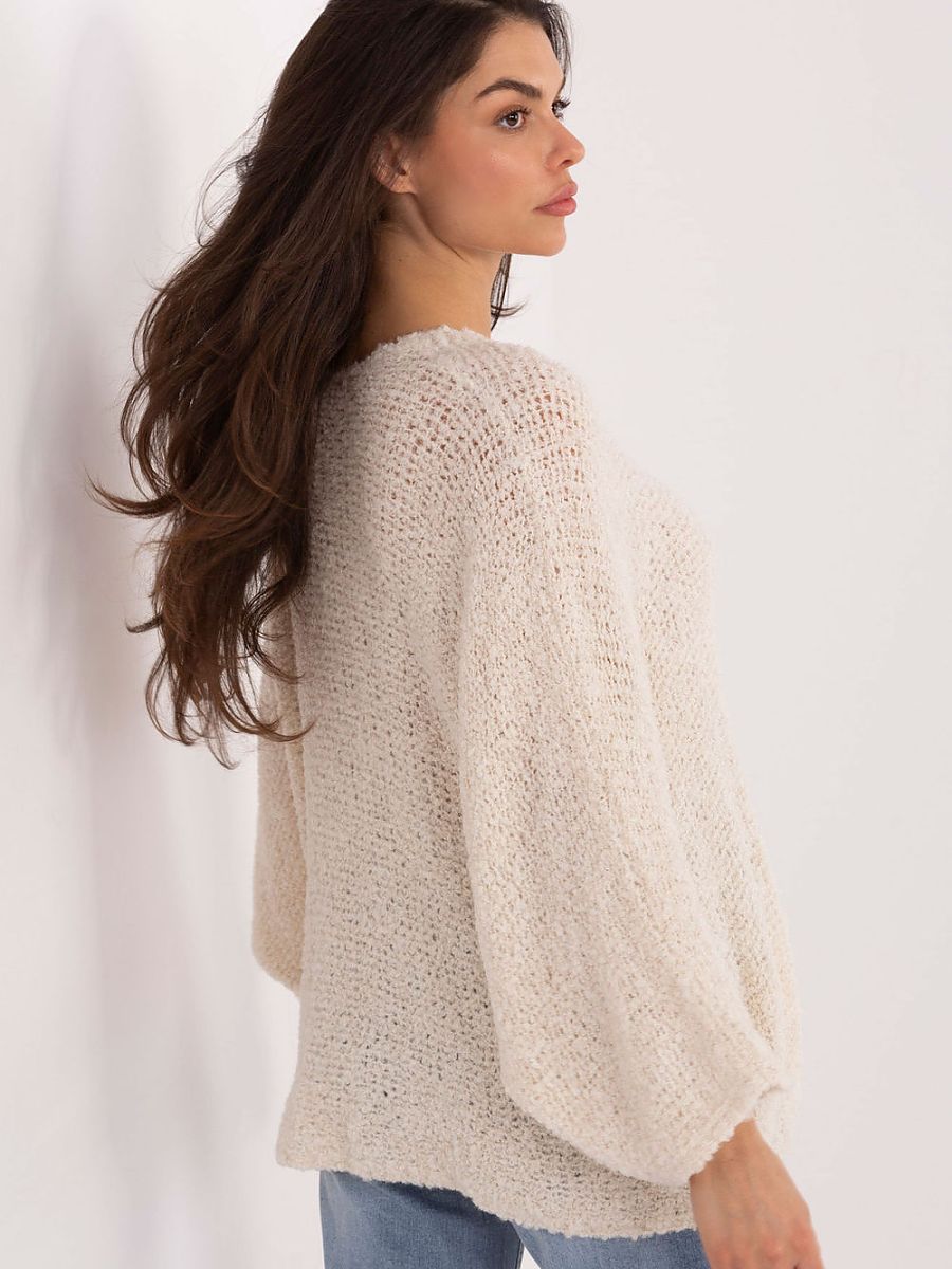 Women’s boucle sweater is a stylish and comfortable option for everyday styling. Made of a pleasant to the touch blend of acrylic, viscose, wool, and polyamide, it provides comfort, warmth, and durability. The characteristic looped structure of the material gives it a fashionable, cozy character. The model of standard length with long, puffy sleeves looks modern and feminine. The v-neck subtly emphasizes the neck and visually slims the silhouette. The smooth pattern and lack of fastening make the sweater versatile and easy to style, perfect for everyday wear, both with jeans, skirts, or elegant trousers.