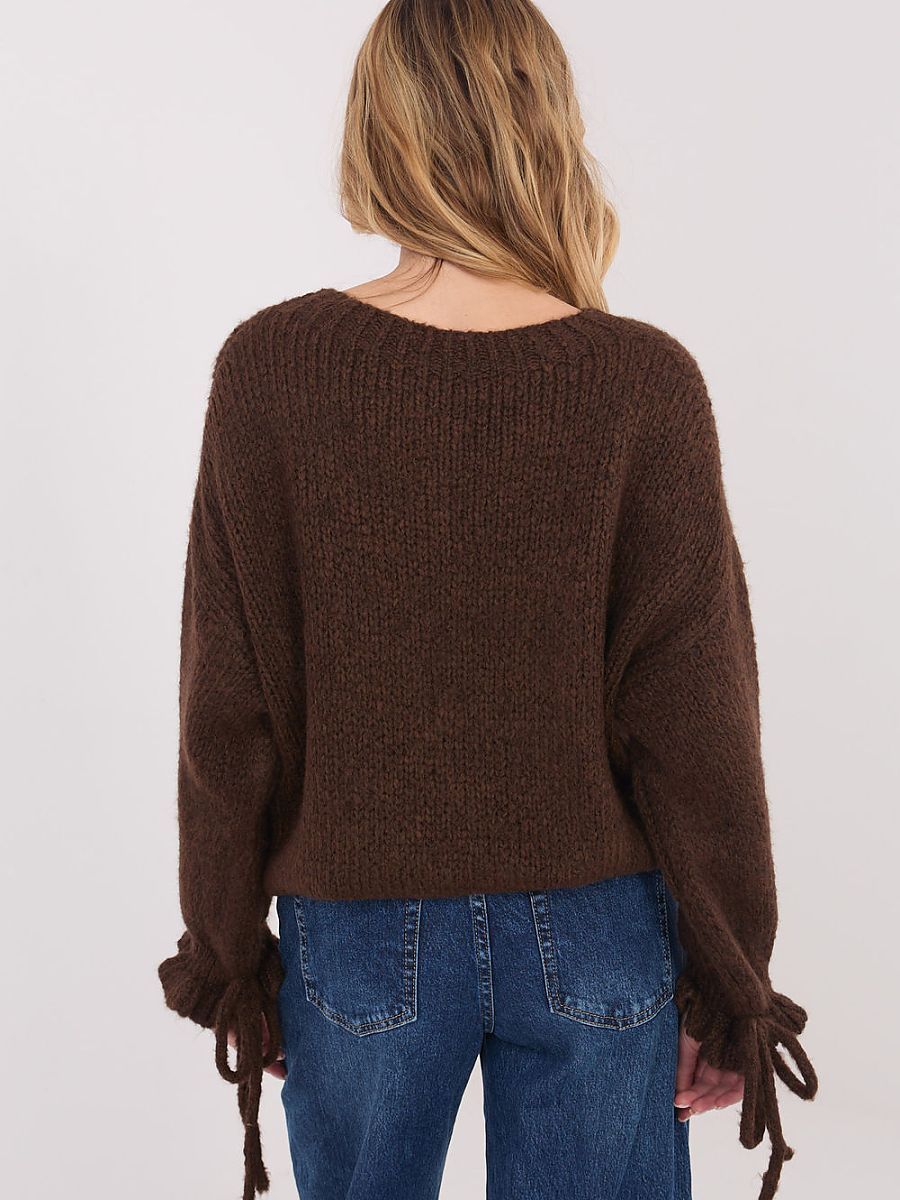 Ladies’ casual sweater, perfect for everyday styling and work. A model of standard length, made of a soft and pleasant to the touch blend of acrylic, polyamide, viscose and wool, which ensures comfort and warmth. The smooth pattern gives the sweater a universal look, making it easy to match with different wardrobe items. The classic, round neckline and long sleeves emphasize the timeless cut. Decorative ruffles with ties on the sleeves add feminine charm and subtle originality to the whole look. The sweater has no fastening, which ensures comfort and freedom of movement.