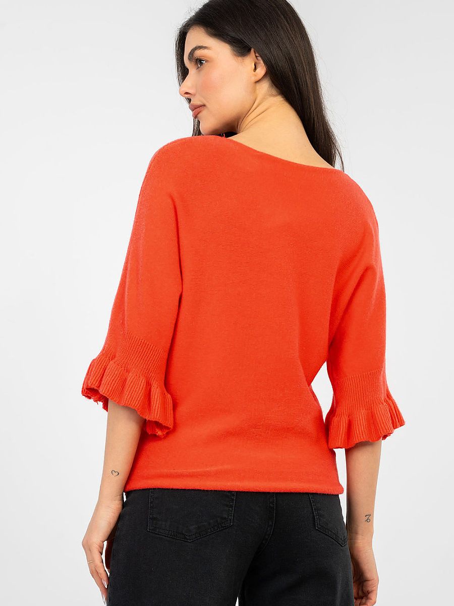 Elegant women’s sweater of standard length, perfect for both everyday wear and special occasions. Made of high-quality blend of viscose, polyester, and nylon, it provides comfort and durability. The smooth pattern gives it a timeless character, and subtle details add feminine charm. The model stands out with a round neckline and 3/4 sleeves finished with a delicate ruffle, emphasizing elegance and lightness of styling. It is a perfect choice for women who appreciate classic style with a modern twist.