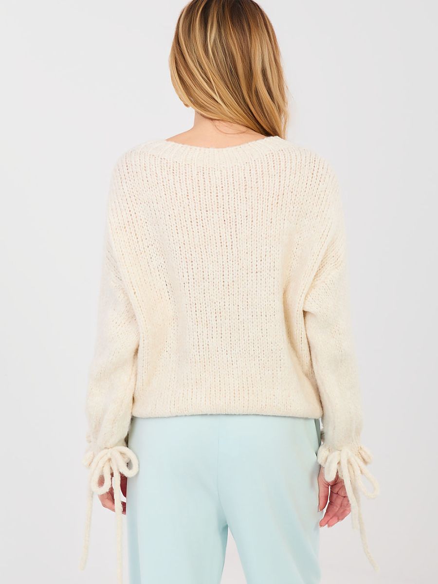 Women’s sweater with a casual character, perfect for everyday styling and work. A model of standard length, made of a soft and pleasant to the touch blend of acrylic, polyamide, viscose and wool, which ensures comfort and warmth. Smooth pattern gives the sweater a universal look, making it easy to match with different wardrobe items. The classic, round neckline and long sleeves emphasize the timeless cut. Decorative ruffles with ties at the sleeves add feminine charm and subtle originality to the whole. The sweater does not have a fastening, which ensures comfort and freedom of movement.