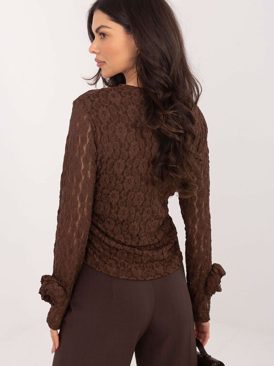 An elegant, fitted lace blouse is a unique model that combines femininity, subtle elegance, and striking details. Made of high-quality viscose with a touch of elastane, it delights with comfort, softness, and a beautiful, varied lace texture. The model features a round neckline and long sleeves without lining, allowing the delicate lace pattern to be fully visible on them. The sleeves are adorned with elegant roses made of the same lace, creating an elegant and very feminine accent. The body of the blouse is lined, providing comfort, aesthetic arrangement, and full freedom of movement. Additional ruching on the sides subtly shapes the silhouette, emphasizing the waist and giving the blouse a refined character. The model has no fastening, it is conveniently put on over the head. This blouse is an ideal choice for formal outings, parties, work, and anywhere you want to combine elegance with exceptional, well-crafted detail.
