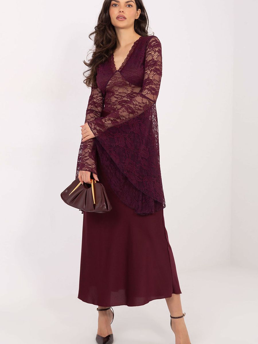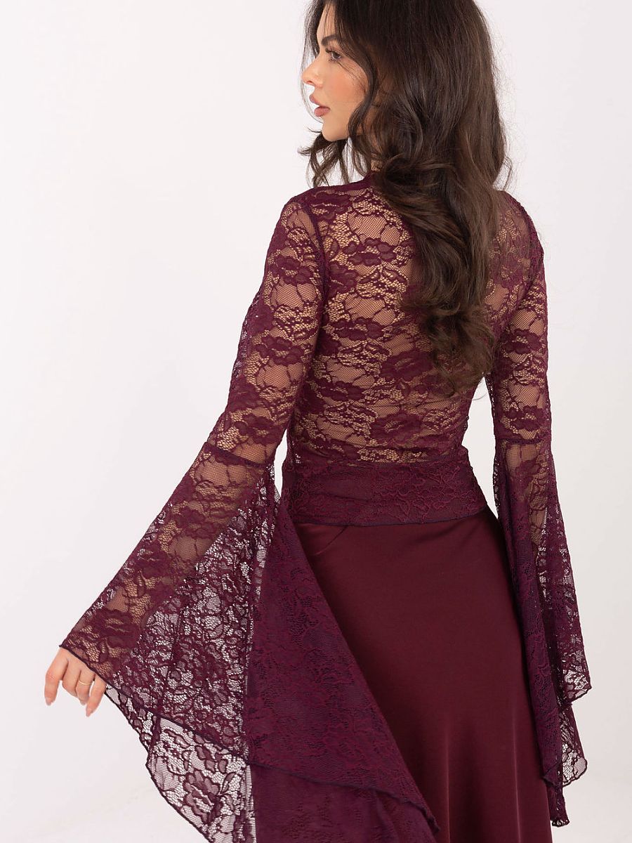 Elegant lace blouse with a stylish and feminine character, perfect for everyday outings, special occasions, and parties. The model attracts attention with a varied texture of the material, which gives the whole a unique, subtle charm. The blouse is made of a combination of polyamide and elastane, which provides flexibility, a perfect fit to the silhouette, and comfort when wearing. The short length combined with the long, flared sleeve from the elbow creates an impressive, modern cut. The V-neck subtly emphasizes the neckline and bust, adding elegance and lightness. The model does not have a fastening and is put on over the head. Additionally, the blouse has a lining on the front, at chest height, which ensures comfort and aesthetic finish. This is an ideal proposal for women who want to combine elegance with a striking, fashionable design.