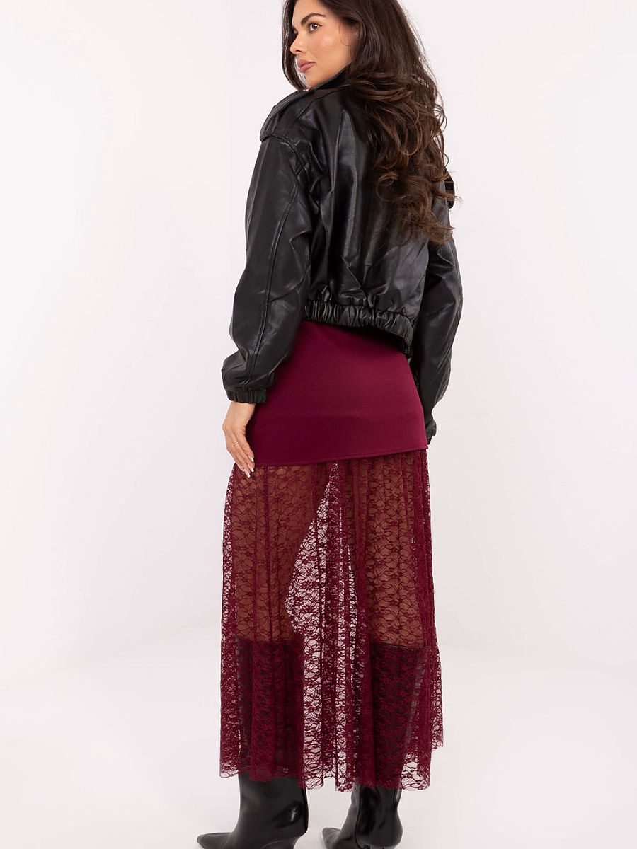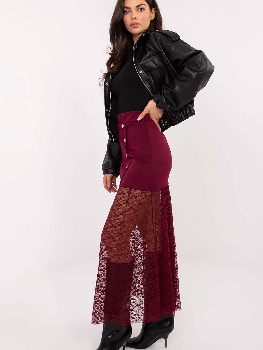 A mini skirt made of fabric with a lace insert is a stylish proposal with a casual character, perfect for everyday occasions. The model combines a classic cut with trendy details, creating a light, feminine effect. The skirt is mini length, which is extended by the sewn lace fabric to midi length, adding lightness and subtle decoration. The varied texture of the material gives the whole sharpness and a fashionable character. Made of a blend of viscose, nylon, and elastane, it is pleasant to the touch, elastic, and comfortable to wear. The elastic band sewn into the waist provides comfort and perfect fit, while decorative buttons on the front serve a decorative role, emphasizing the style of the skirt. The model does not have a fastening, which emphasizes its casual, casual character and makes it easy to put on quickly. It is an excellent choice for everyday stylizations when you want to look fashionable and feminine.