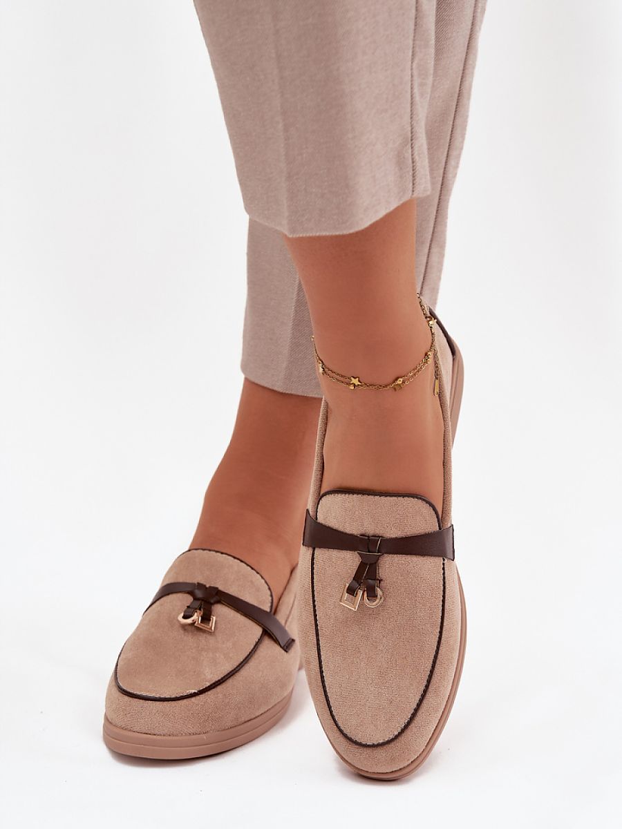 Stylish women’s loafers made of eco suede. The model on a flat heel guarantees comfort throughout the day, and the subtle, decorative detail on the front gives them a fashionable accent. Rounded toes emphasize the classic cut, making the shoes perfect for both casual and more elegant stylizations.