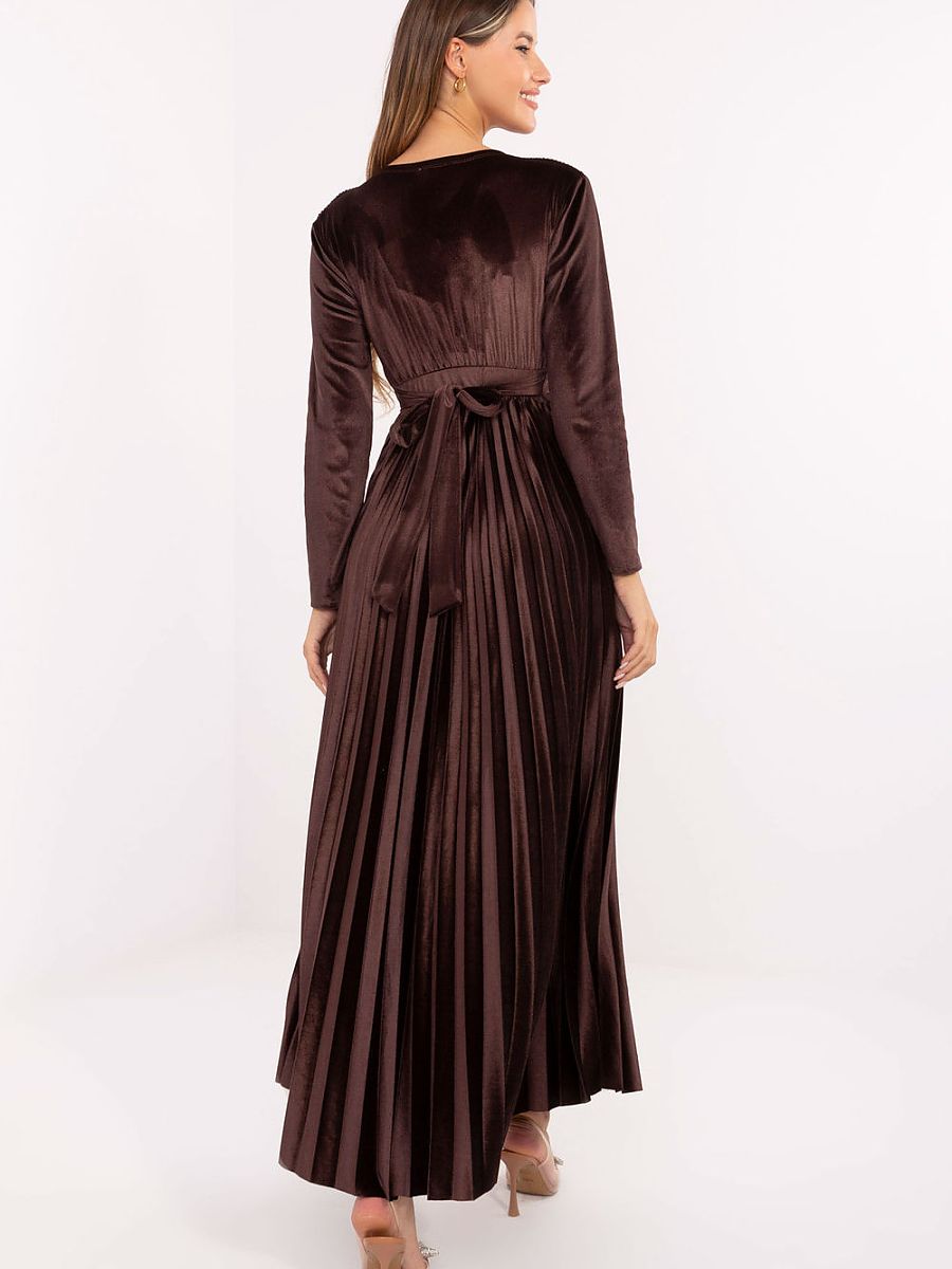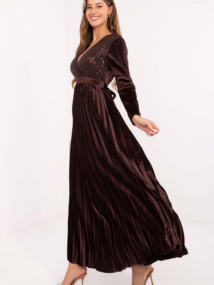 A phenomenal and elegant maxi dress that combines a feminine cut with eye-catching details, perfect for special occasions and parties. Made of a lightweight blend of viscose and polyester, it beautifully drapes on the silhouette, providing comfort and ease of wear. The model features a wrap neckline, long sleeves, and a waist cutout that subtly accentuates the waist. Sewn-in padded cups add support and beautifully shape the upper part of the silhouette. The flared, pleated bottom gives the dress lightness and a striking movement with every step. The top of the dress is adorned with sequins on the front, adding sparkle and elegance, and the tie at the back in the form of a sash allows you to adjust the dress to the silhouette and accentuate the waist. The dress does not have a classic closure, it is put on over the head, emphasizing its casual, light character. It is a proposal for women who appreciate elegance, eye-catching details, and comfort of wear, perfect for evening outings, parties, and special occasions.