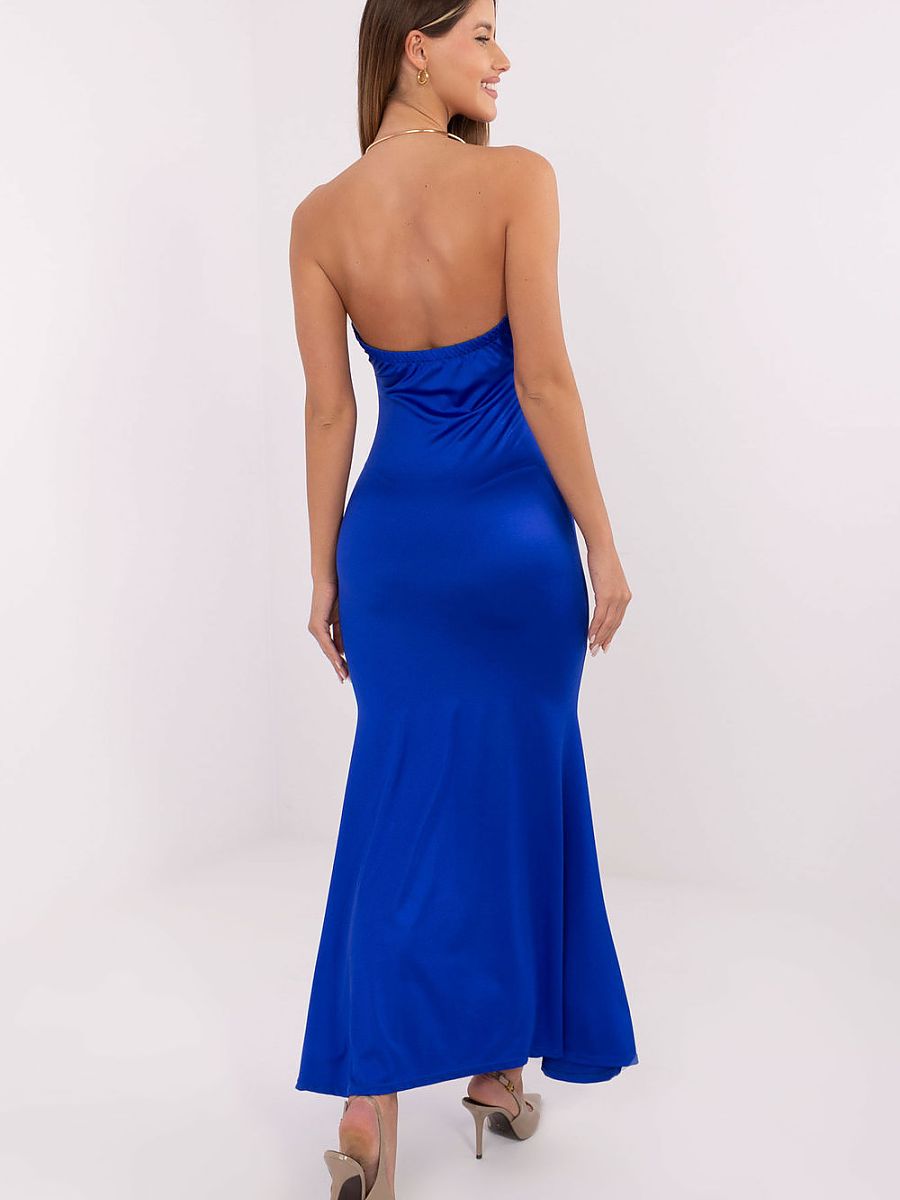 An elegant maxi dress with a sensual mermaid cut, perfect for formal occasions and events where style and a striking appearance matter. Made of a dominant blend of polyester and viscose, it subtly flows around the silhouette, emphasizing its shapes and providing comfortable wear. The model delights with a smooth, minimalist pattern that gives the creation class and a timeless character. The dress is sleeveless, and attention is drawn to the deep, flowing neckline, creating an elegant line and delicately exposing the shoulders. A special accent is the dress fastening at the neck with a metal ring, serving both a decorative and practical function. The lack of a traditional closure makes the dress look exceptionally fluid and modern, with its shape remaining undisturbed by additional elements. It is the perfect choice for women who want to stand out with elegance combined with a modern, bold line.
