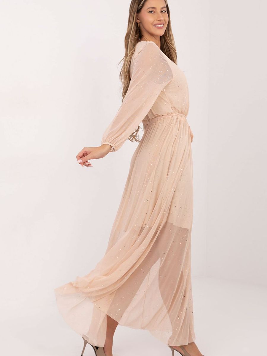 Elegant maxi dress made of mesh is a unique proposal for formal occasions, ideal for women who appreciate subtle shine and lightness. Made of a blend of polyester and viscose, it looks impressive, while also providing comfort thanks to the soft lining. The flared cut model beautifully falls during movement, creating a feminine and airy silhouette. An elastic band and a tie belt at the waist emphasize the waist and allow you to adjust the fit to your own preferences. Long sleeves made of delicate mesh, a round neckline, and shiny elements on the material give the dress an elegant, evening character. The maxi length further emphasizes its elegant style. Stylish, feminine, and extremely eye-catching, perfect for parties, ceremonies, and special outings.