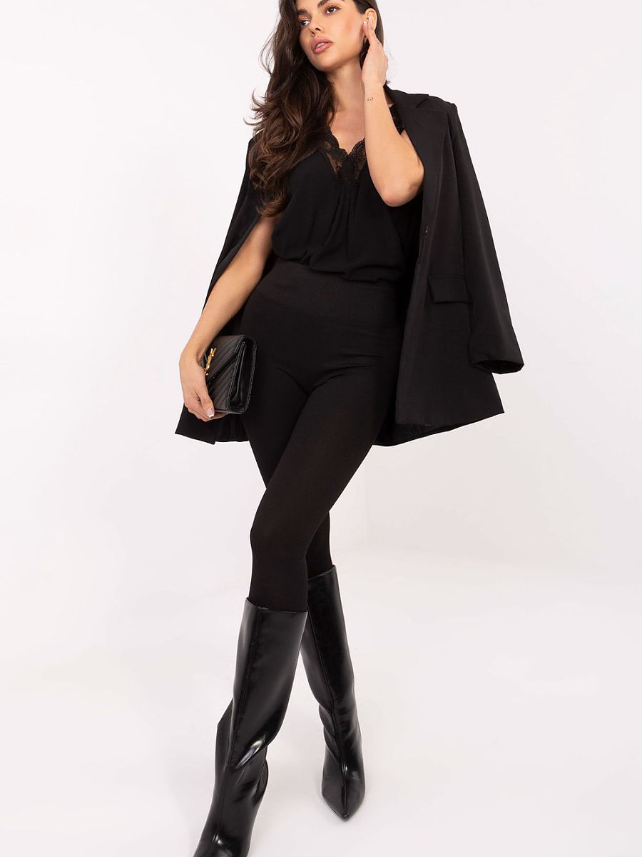 Adherent women’s leggings-style pants made of sweatshirt knit are comfortable and reliable for sports on autumn days or hectic life in the big city. The pants have a wide waistband and small darts at the back to accentuate the figure. The leggings are sewn from OEKO-TEX Standard 100 certified knit fabric.