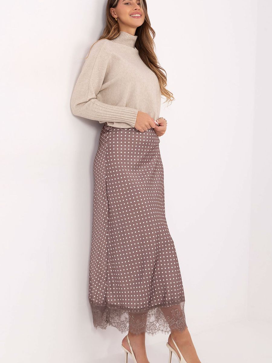 Stylish and feminine midi skirt made of a pleasant to the touch material, polyester with elastane, which ensures comfort and perfect fit to the silhouette. The model is decorated with delicate lace at the bottom, giving it elegance and subtle character. An elastic band has been sewn in at the waist, so the skirt fits perfectly to the waist and does not require fastening. The material is adorned with a fashionable polka dot pattern, which adds lightness and charm to the whole. This is a versatile model that will work well for everyday wear, for work, as well as for special occasions.