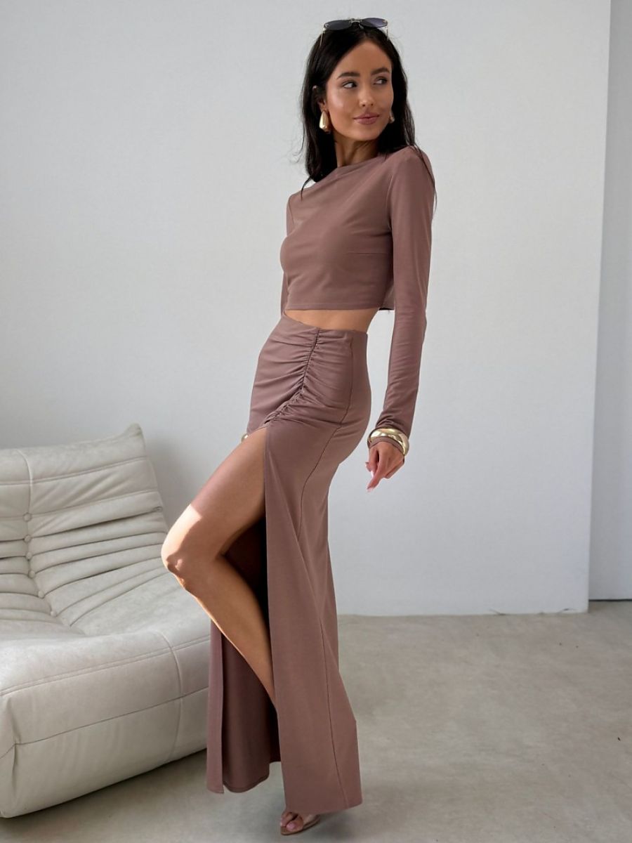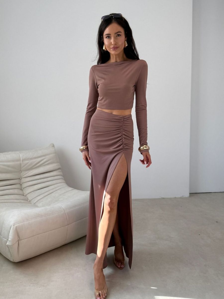 Elegant maxi skirt with eye-catching ruching and a high slit on the leg, which subtly accentuate the silhouette and give the styling a sensual character. The fitted cut fits perfectly on the body, providing comfort for wearing all day long. Designed and sewn in Poland, this model will work great both in an elegant combination with a fitted top and heels, as well as in a modern version with a minimalist blouse and sandals. An elastic band is sewn into the waist, guaranteeing a perfect fit.