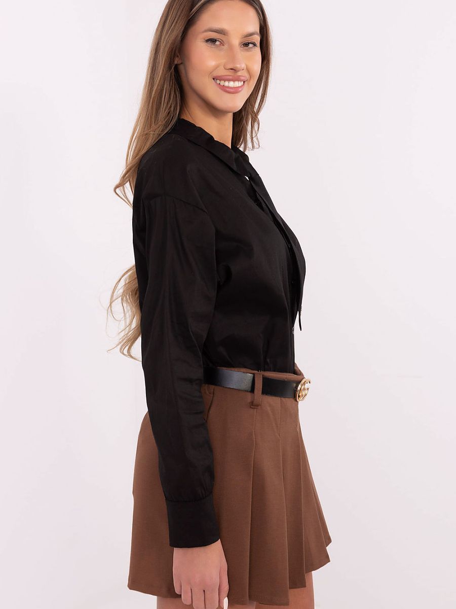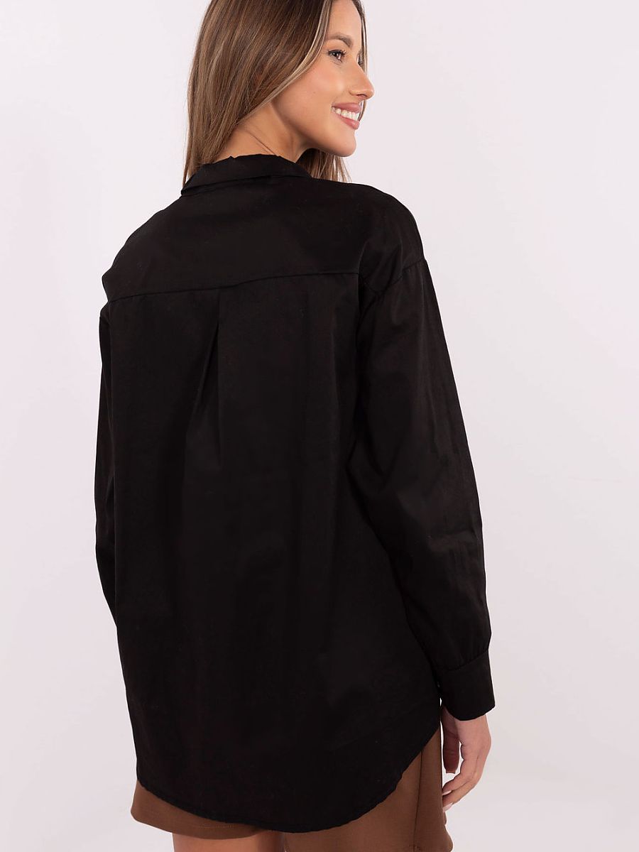 Casual women’s shirt with a universal cut, perfect for everyday wear. Made from a combination of cotton and elastane, it provides comfort and a perfect fit to the figure. Smooth material makes the shirt a versatile base for a variety of styling. The model has a classic collar and button closure, which gives it a timeless character. The standard length and long sleeve make the shirt a practical choice for any season. Unique features, such as a removable tie and detachable brooch, allow you to personalize and customize the shirt for different occasions. Add the tie and brooch for an original style, or remove them for a more casual look. Perfect for women who appreciate classic elegance with a casual touch.